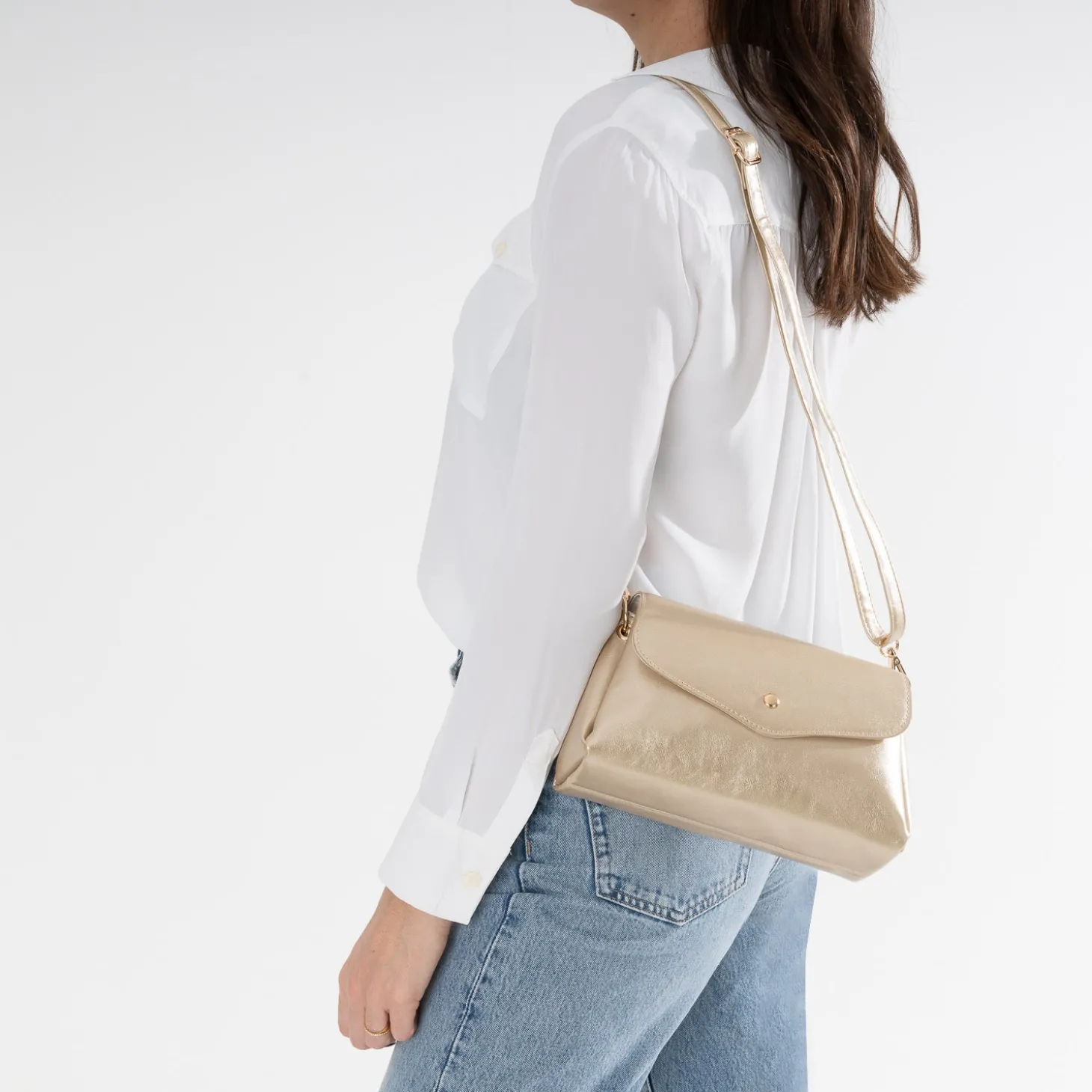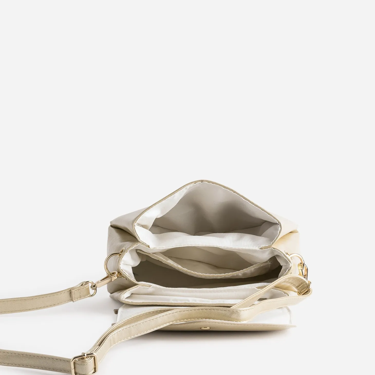 De format moyen, ni trop petit ni trop grand, ce sac à main pour femme a été pensé pour le quotidien. En matière synthétique, il séduit par sa souplesse et par son coloris doré et sa finition métallisée, parfaitspour la saison, mais aussi par ses 3 compartiments, pour une organisation optimale. Ses alliés mode ? Un costume pastel, ou une chemise bleue à fines rayures sur un jean, avec des mocassins assortis.