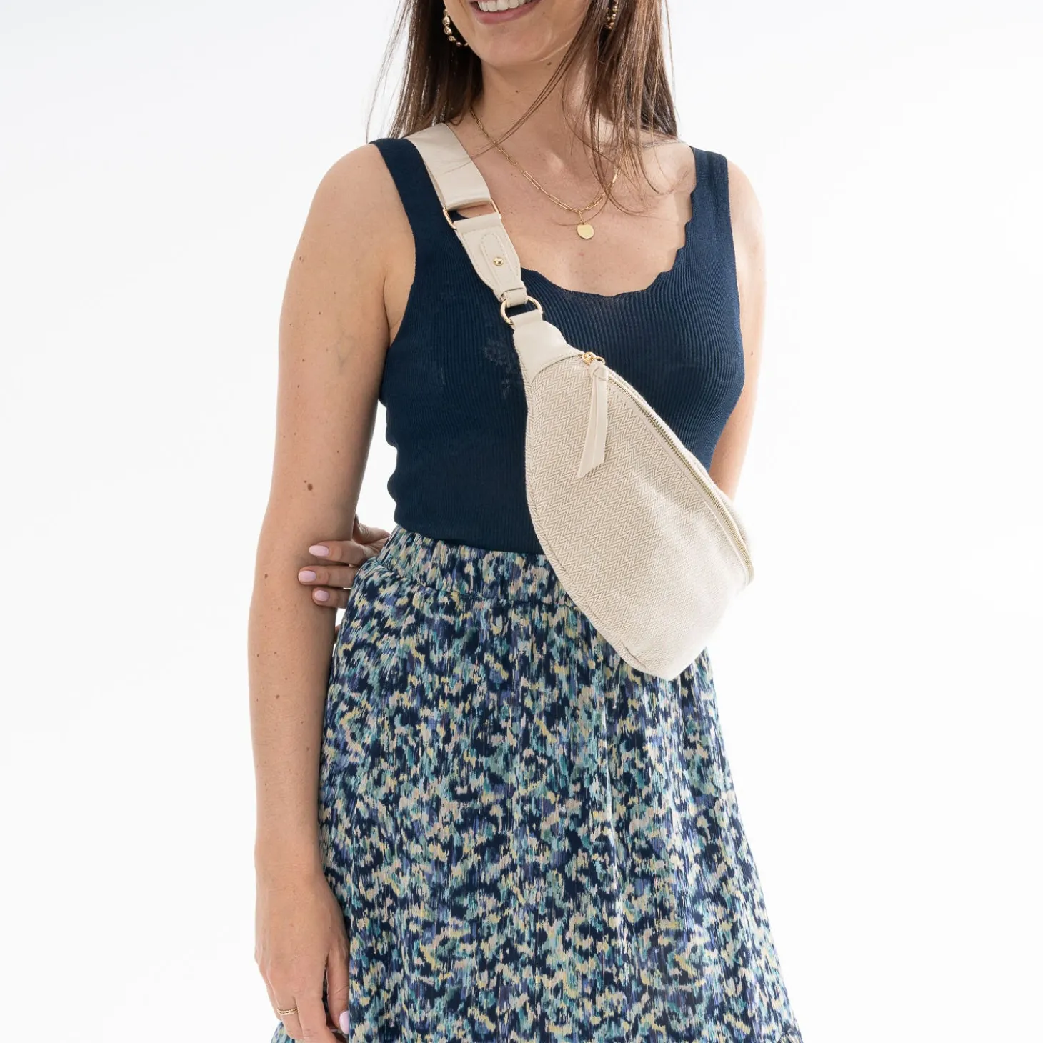 C’est le moment de passer le cap ! Le cap du sac-banane, it-bag incontournable de la saison. Laissez-vous convaincre par son motif chevrons sur textile beige, et ajustez sa bandoulière, pour un porté cross-body. Parfait sur un total look dans les tons clairs.