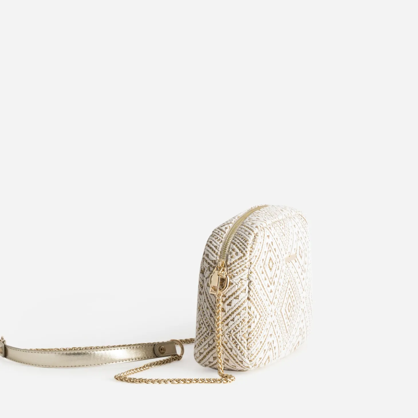 Ethnique et chic, c’est la définition du style de ce sac à main pour femme. Tressage beige et fils dorés s’associent dans une parfaite harmonie. La bandoulière bi-matière chaînette et les métalleries apportent un côté glam’. Un modèle à porter sur l’épaule ou croisé, avec une tenue habillée.