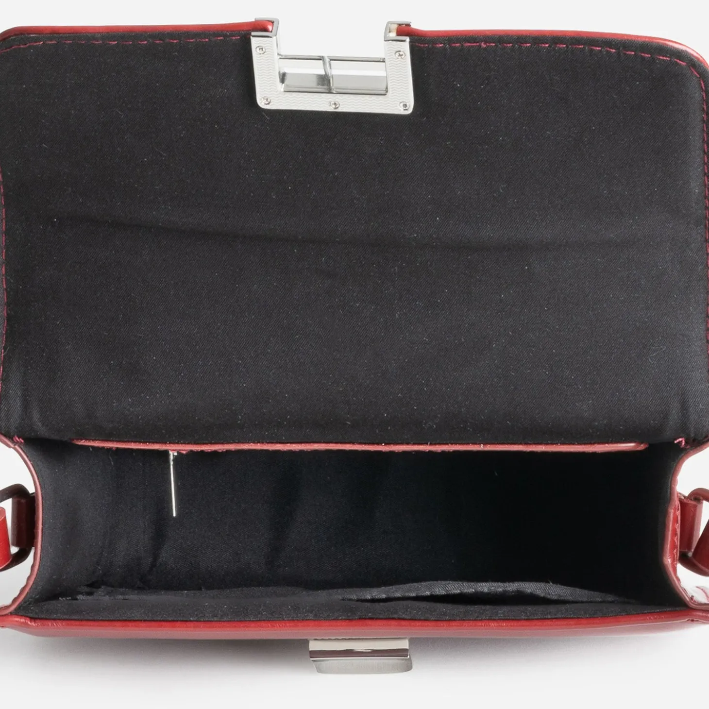 Qui dit rentrée, dit nouveau sac (à main) ! En matière synthétique rigide, il se décline en coloris rouge foncé. Son format rectangulaire assure un porté élégant, sur l’épaule ou croisé, grâce à la bandoulière réglable (non amovible). Le rabat se ferme par un système de clip-cartable fantaisie (appuyez vers le bas pour libérer le rabat). Un accessoire à privilégier avec un pull-chaussette rouge foncé à col roulé sur un jean large gris, avec des boots esprit rétro.