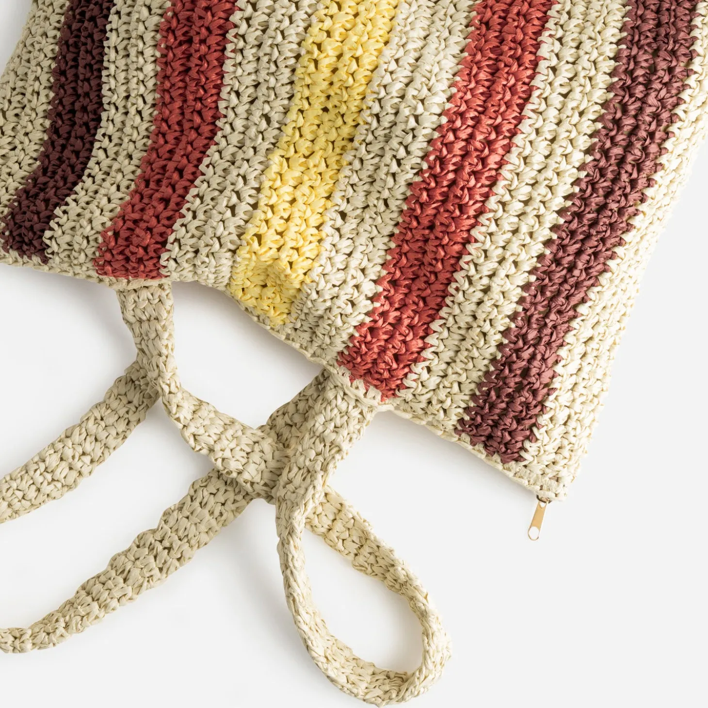 Adoptez la tendance du tote bag avec un modèle original et pratique. Confectionné en paille papier beige clair tressé, ce sac apporte une touche de couleur aux tenues par un jeu de larges rayures marron, rouge corail et jaune. Les anses sont assez longues pour vous permettent de le porter facilement à l’épaule. Un accessoire indispensable pour toutes vos sorties, avec une robe midi fluide orangée ou un tee-shirt blanc imprimé citrons et un pantalon en lin marron.