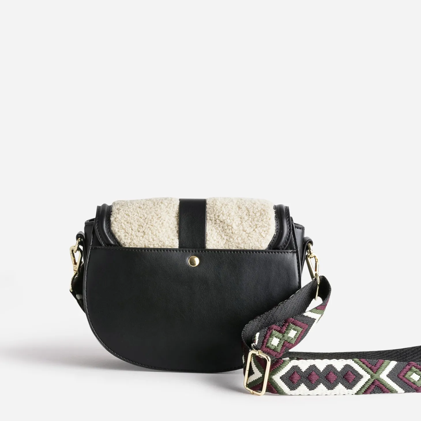 L’hiver appelle des matières plus douces, plus chaleureuses. Optez pour un sac à main de saison, en matière synthétique noire, rehaussée d’un rabat recouvert de tissu Sherpa beige. Il se porte soit sur l’épaule, soit croisé, grâce à une large bandoulière tissée à motif ethnique, ajustable et amovible. Un modèle à associer avec un look dans les mêmes tons.