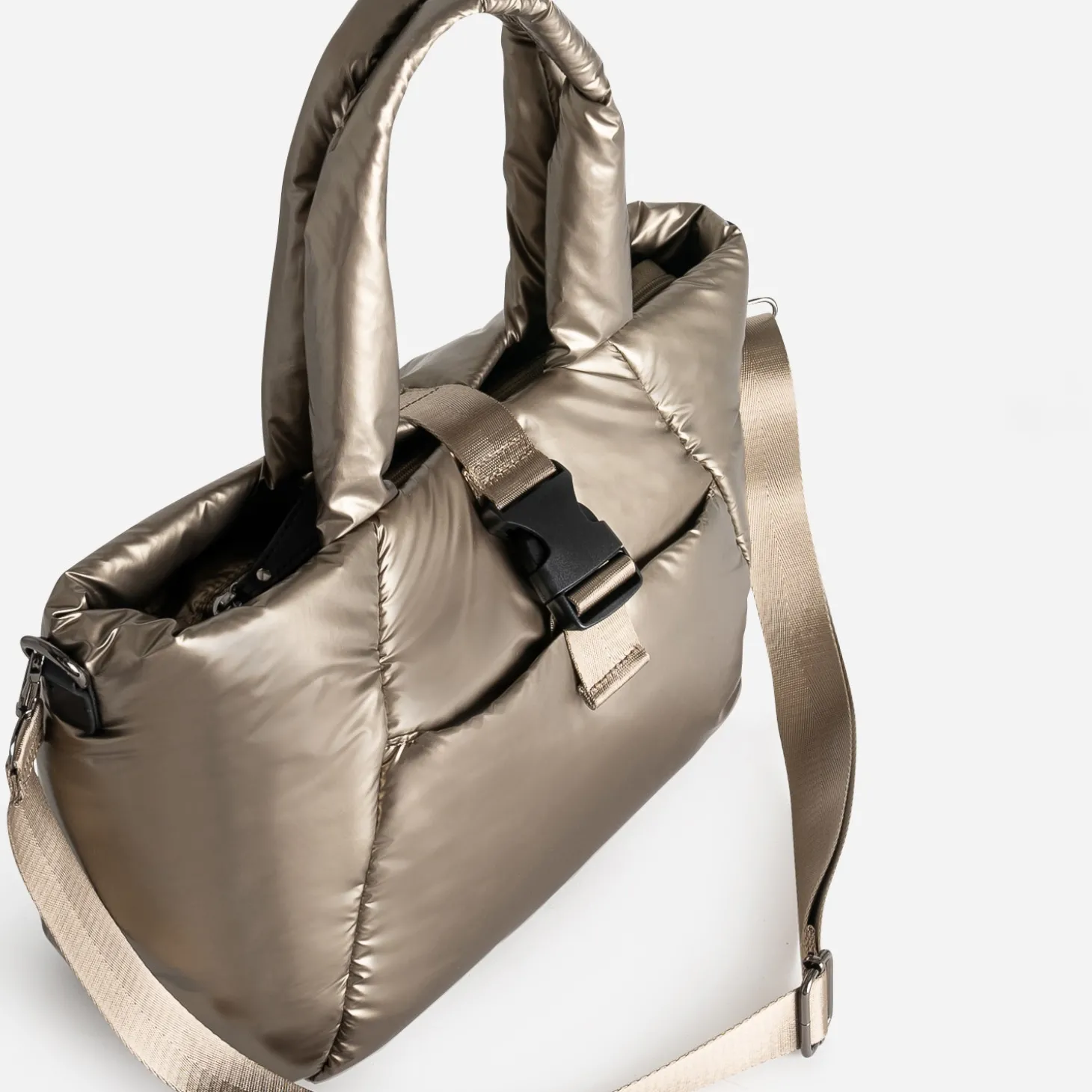 Si la doudoune revient dans le dressing à l’approche de l’hiver, le sac cabas y puise son inspiration cette saison. En nylon bronze, il lui copie son gonflant, jusqu’aux anses à poser sur l’épaule, et son matelassage spécifique. Il se ferme par un zip, doublé par un clip, emprunté au sac à dos. Un modèle casual, à préférer avec un look décontracté, sweat, jogging et sneakers en tête.