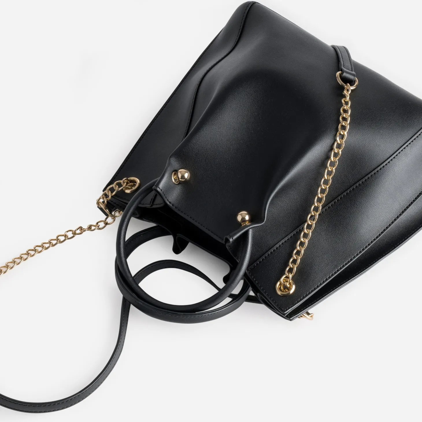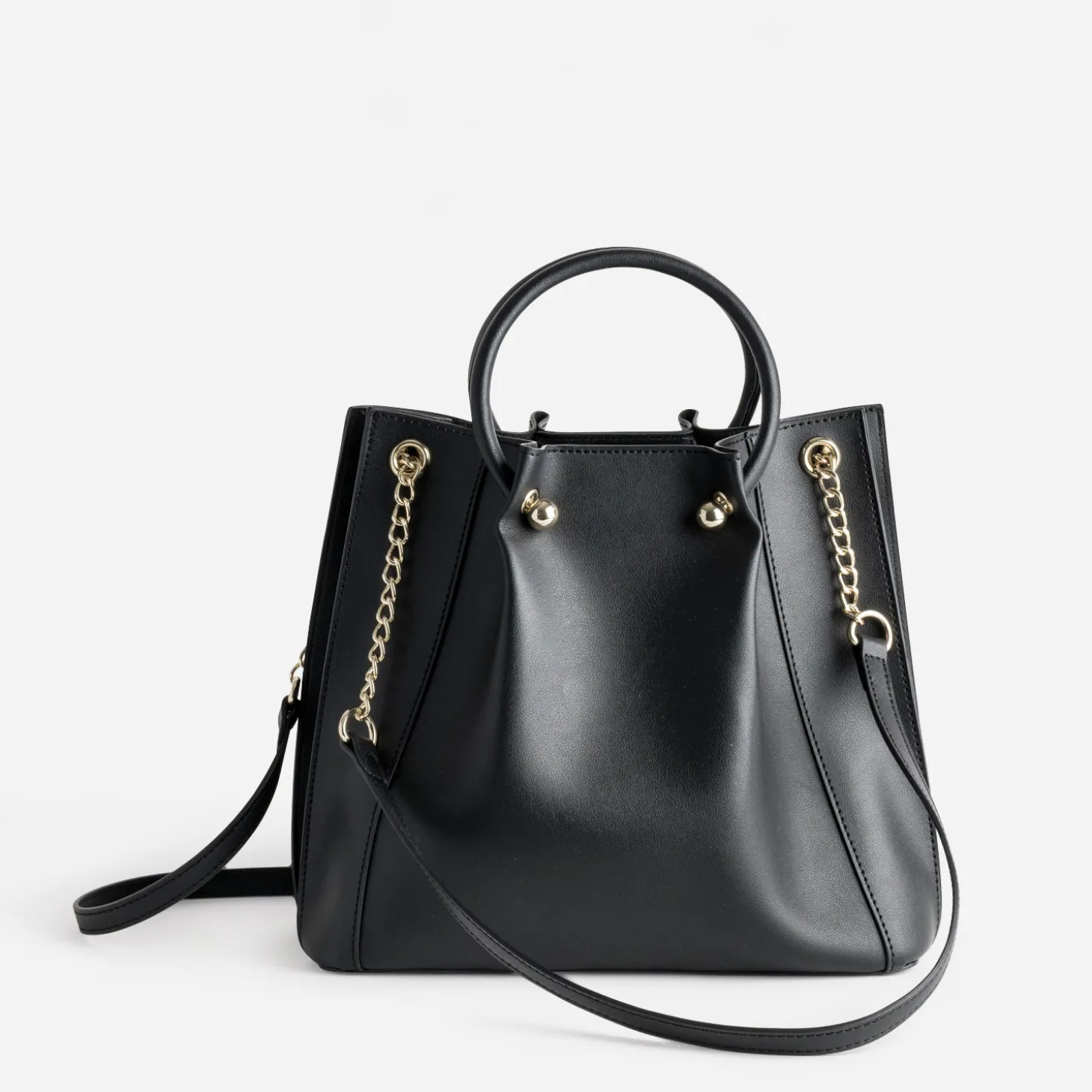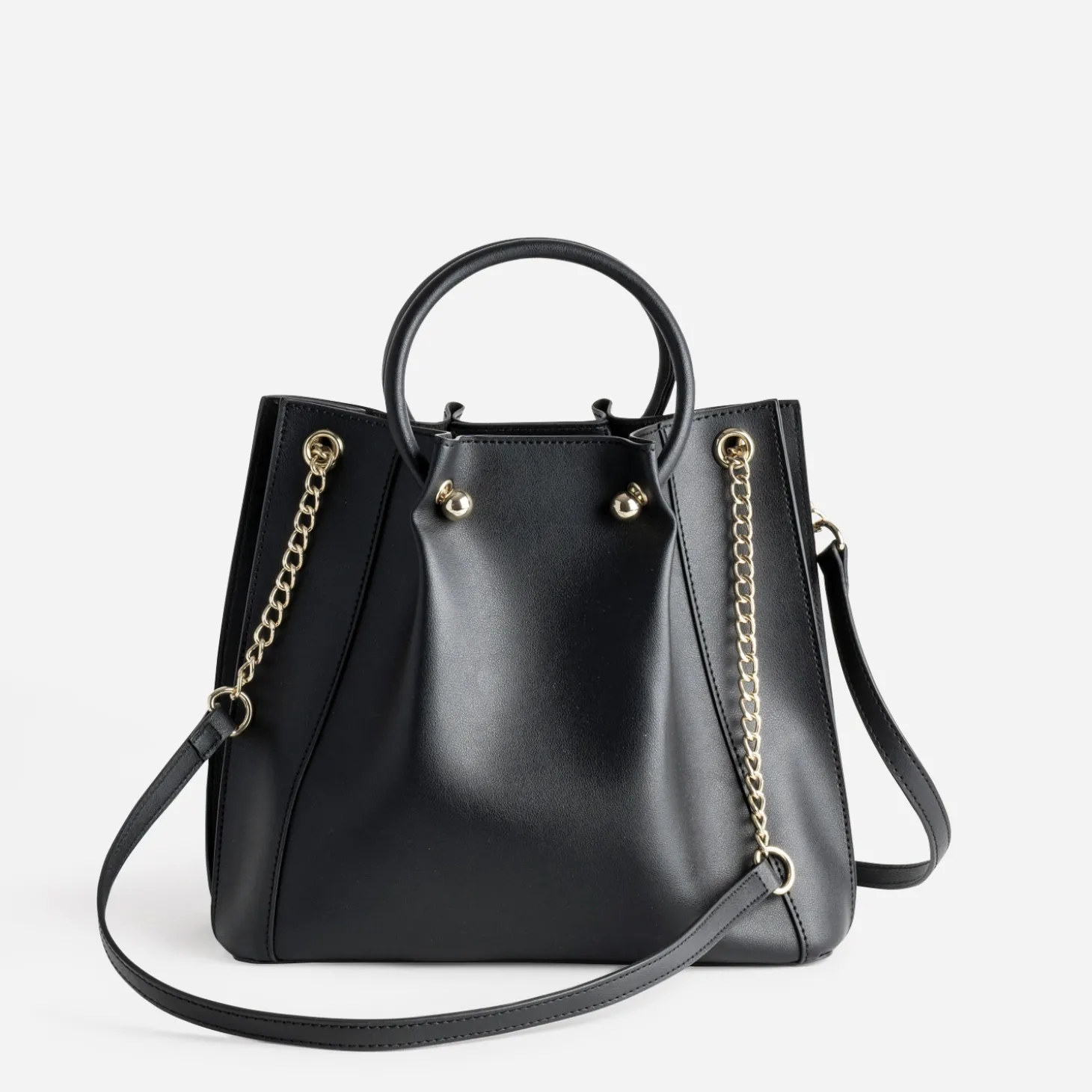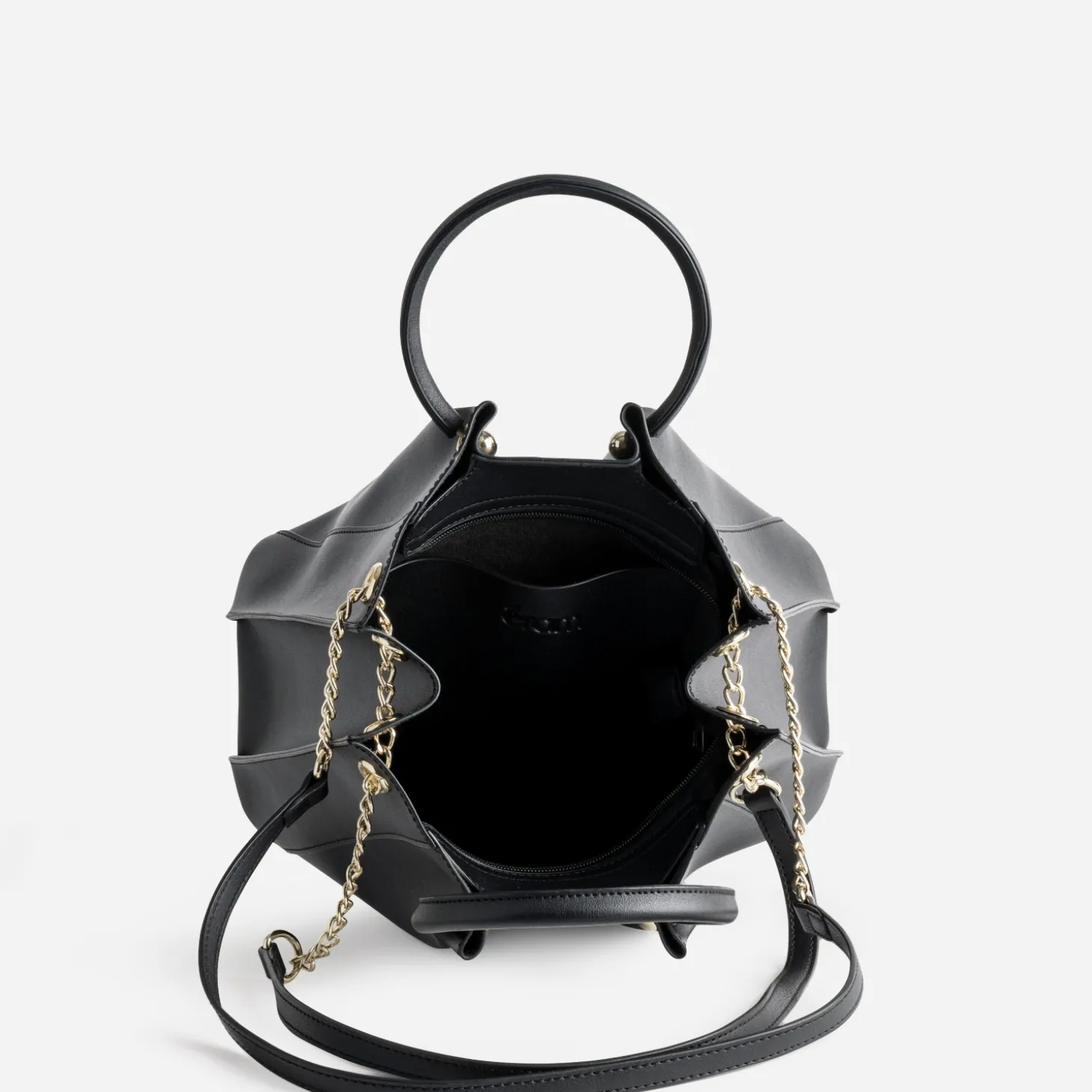 Inspiré par le sac seau iconique, ce sac à main propose une interprétation plus moderne. En matière synthétique noire, il présente une forme carrée, modulée par des découpes et des anses rigides façon anneau recouvertes. Dans le grand compartiment, une poche plate accueille clés ou cartes, faciles d’accès. Il se porte bien sûr à la main, mais aussi sur l’épaule ou croisé, grâce à une bandoulière bi-matière, à coulisser. Les métalleries dorées confirment son élégance. Un modèle à conjuguer avec une blouse à lavallière et manches bouffantes écrue, un jean noir flare, des boots à talon.