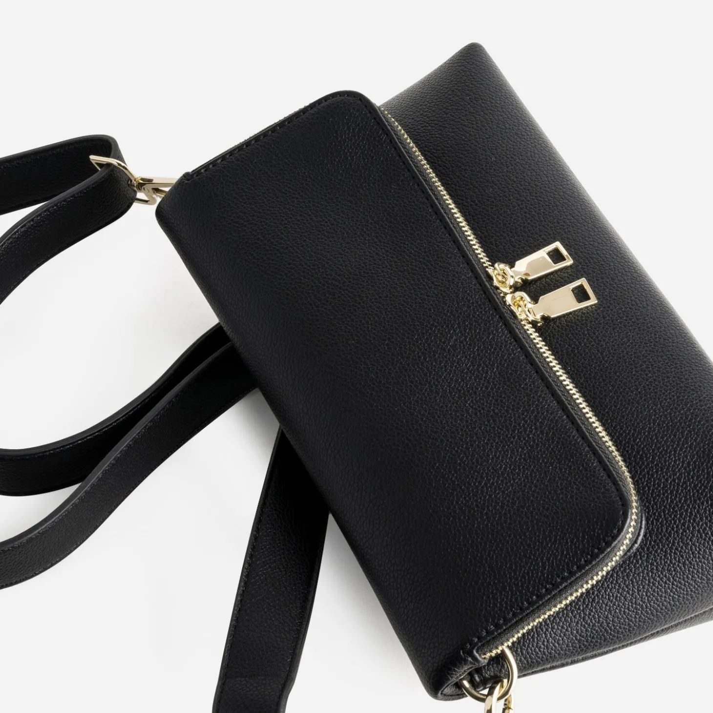 Tour de magie en action ! Ce sac à main pour femme crée la surprise, par une forme trapèze s’ouvrant, en hauteur, sur un grand compartiment fermé par un double curseur et qui se replie sur le devant, comme un rabat aimanté. A l’intérieur, la poche zippée permet d’isoler clés ou cartes. En matière synthétique grainée, il se décline en coloris noir, avec métalleries dorées. La bandoulière amovible et réglable permet d’ajuster le porté sur l’épaule ou croisé. Un accessoire fonctionnel et intemporel, pour vous accompagner au quotidien.