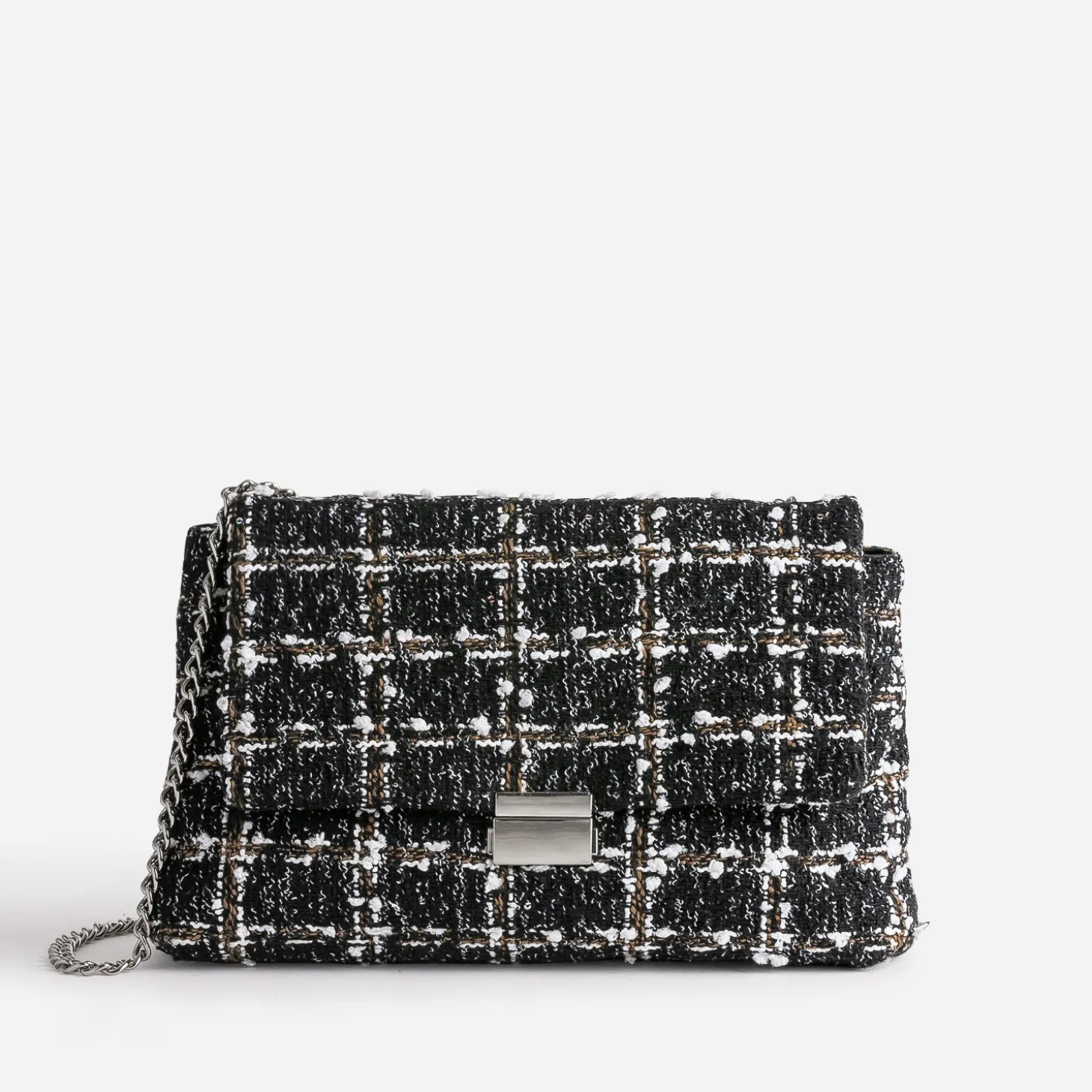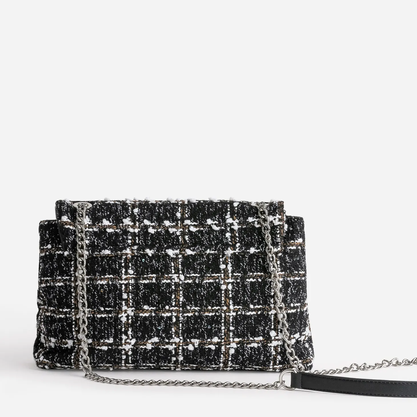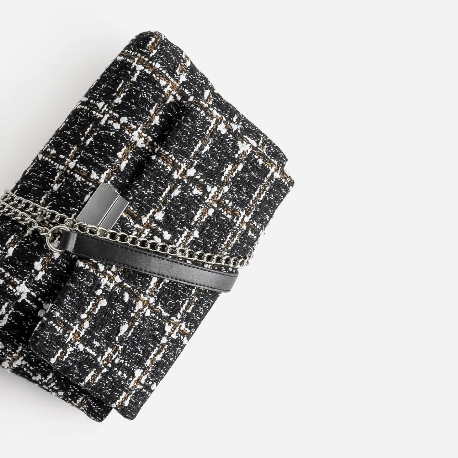L’esprit Couture sublime l’allure. La preuve, encore une fois, avec ce sac à main femme en textile façon tweed. Noir, écru et camel, il est rythmé d’un effet carreaux et de sequins brodés, sur une forme rectangulaire. Découvrez la bandoulière ajustable courte ou longue, grâce à un système de coulisse judicieux.