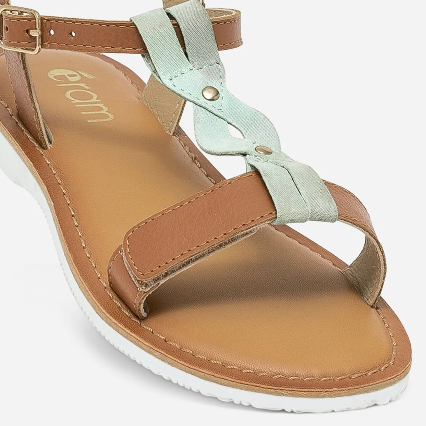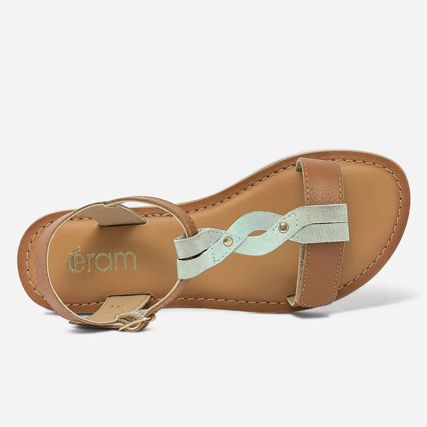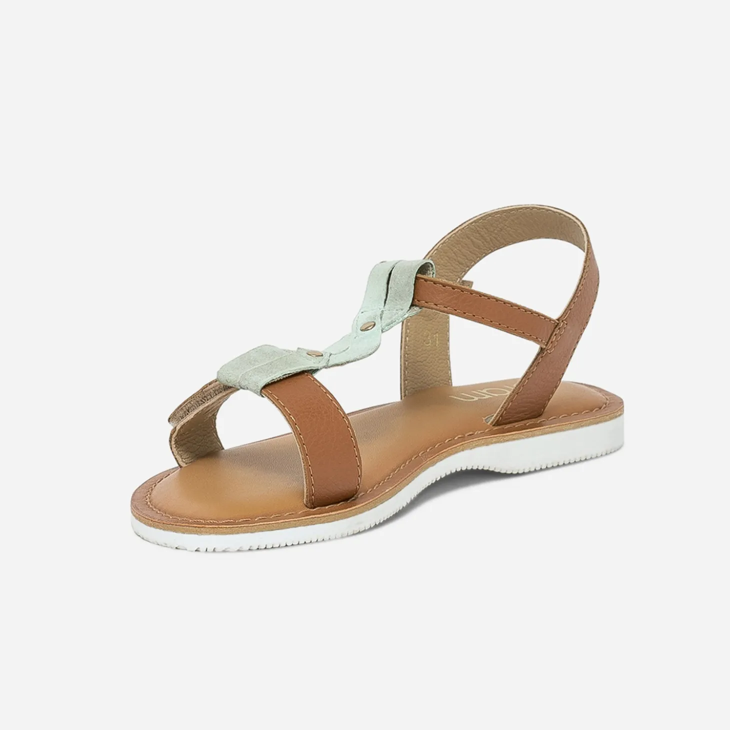 1 sandale, 3 façons de la porter. Confectionnée en cuir camel, elle est livrée avec 2 brides en T amovibles, l’une irisée arc-en-ciel, l’autre irisée vert sauge, à glisser, ou pas, dans les brides de la cheville et du dessus. Les fermetures par boucle et scratchs permettent un ajustement impeccable du pied. Un modèle qui va ravir les petites filles autant que les mamans.