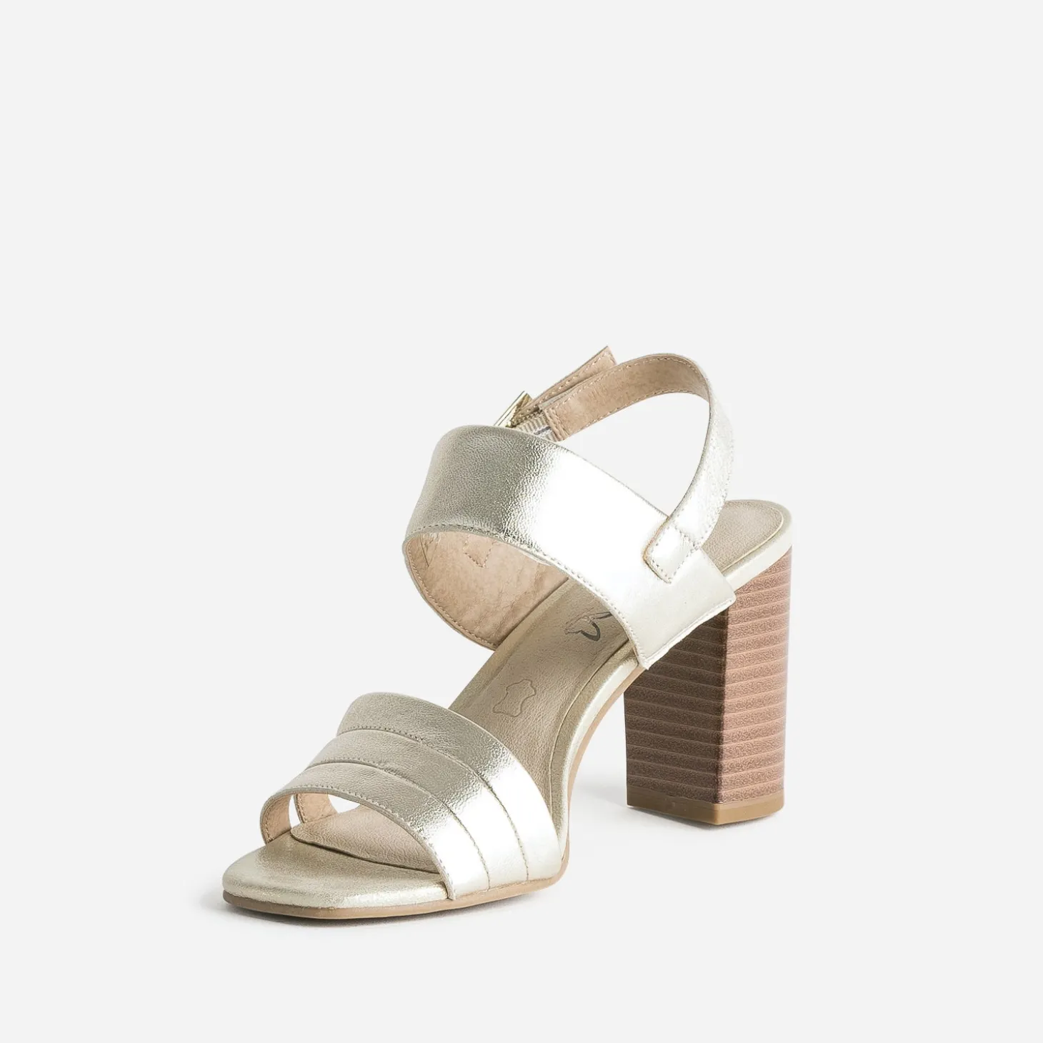 Et si vous vous laissiez surprendre par la sandale à talon ? Confectionnée en cuir lisse, elle se décline en coloris doré. Son talon de plus de 8 cm gagne résolument en confort grâce à une semelle moussée. Un modèle à réserver pour une belle occasion, avec, pourquoi pas, un tailleur-pantalon.