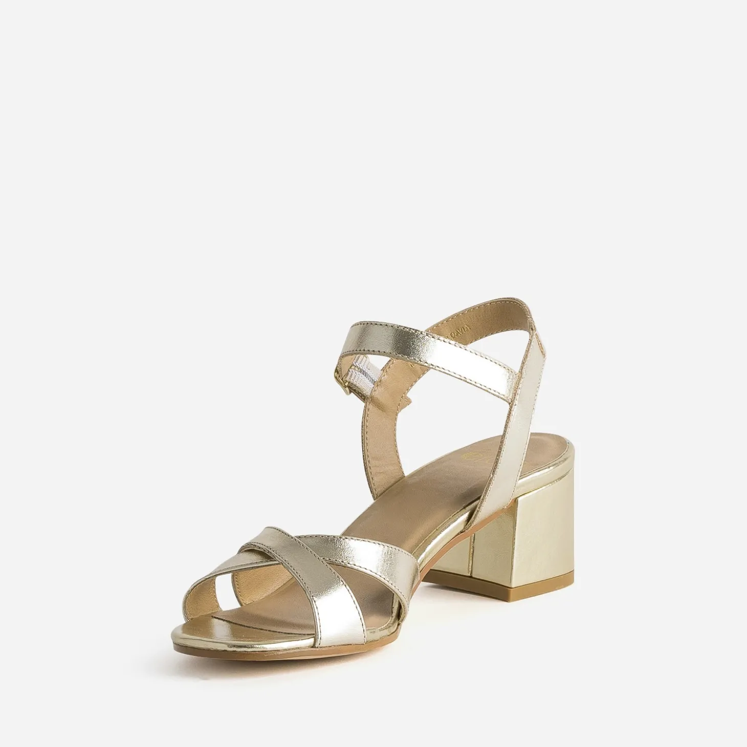 Cette sandale femme frôle la perfection. En cuir doré, du bout du pied, jusqu’au talon, elle est montée sur un talon flare de 5 cm, ni trop haut ni trop plat, avec brides croisées. Avec un T-shirt blanc et un jean droit cropped en journée, avec une robe longue noire, en soirée, elle s’impose comme un incontournable que vous allez adorer porter tout au long de la saison.