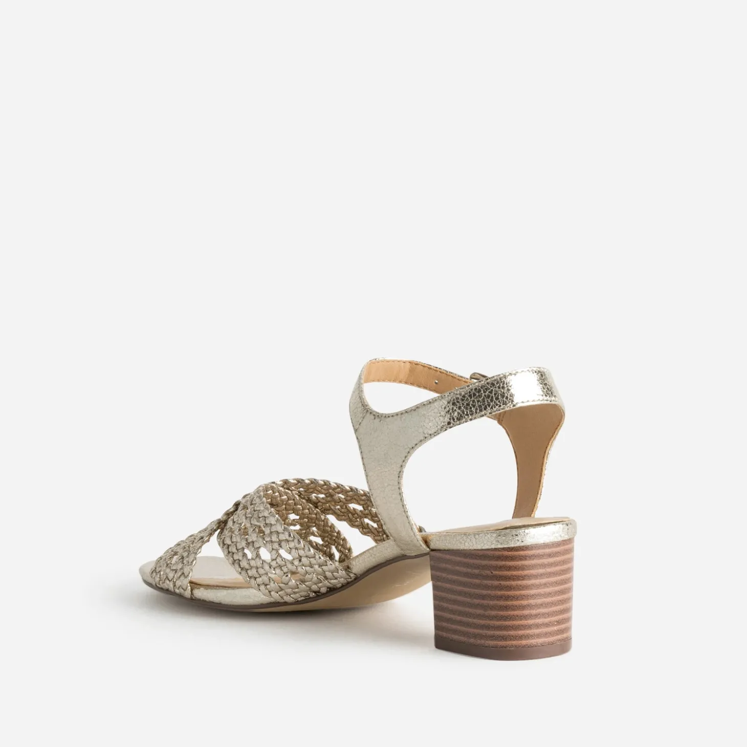 Le look bohème chic fait la part belle aux détails, et notamment les jeux de tressage. Cette sandale à talon pour femme l’illustre parfaitement par une matière synthétique métallisée dorée. Montée sur un petit talon lamellé effet bois, elle maintient le pied par des brides croisées sur le pied et autour de la cheville. Un modèle sublime pour mettre en valeur toutes les robes d’été, qu’elle soit noire et forme chasuble, blanche avec plastron volanté ou vert irisé forme tube.