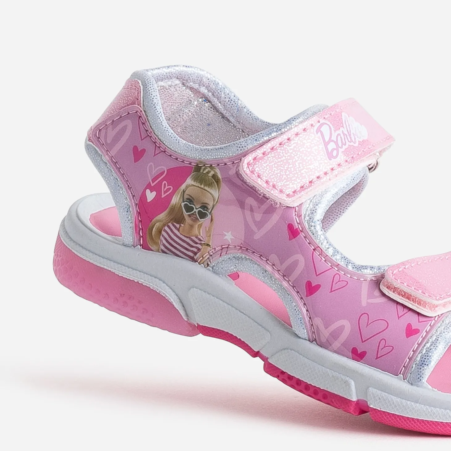 Impossible de ne pas remarquer son logo, imprimé sur le scratch. Impossible de perdre sa trace, grâce à la semelle clignotante. Matière synthétique rose vif et blanc, tout pailleté : cette sandale compile tout ce qu’adorent les petites filles ! Sans oublier, sur le côté, un portrait de la blonde la plus célèbre des cours de récré !