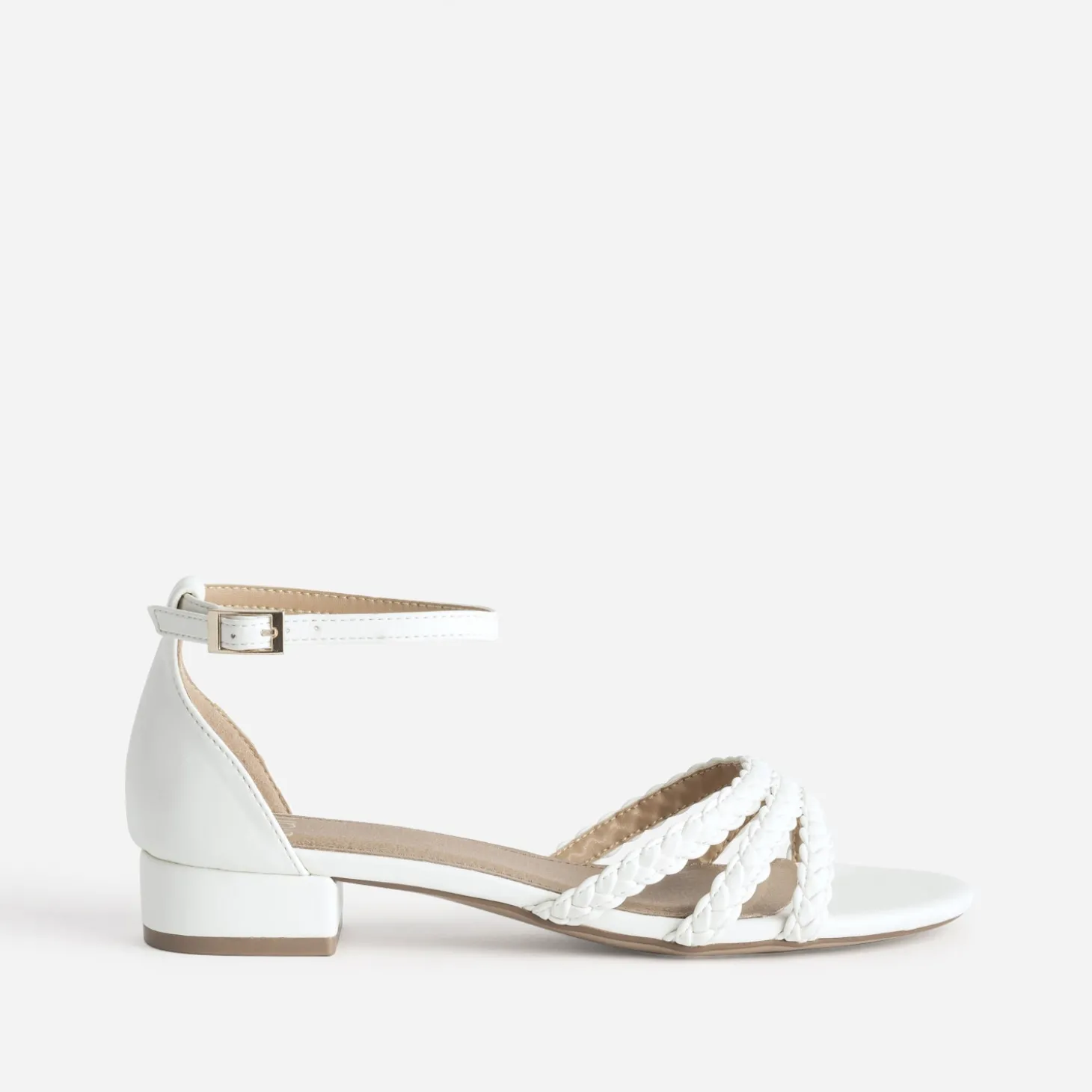 Que ce soit pour une cérémonie ou pour le quotidien, la sandale blanche reste une valeur sûre. En matière synthétique lisse, elle maintient le pied par un subtil jeu de brides tressées sur l’avant du pied et un contrefort avec bride autour de la cheville. Un modèle monté sur un petit talon de 2,5 cm, parfait avec une robe blanche mais aussi avec un tee-shirt marinière et une jupe midi bleu marine boutonnée.