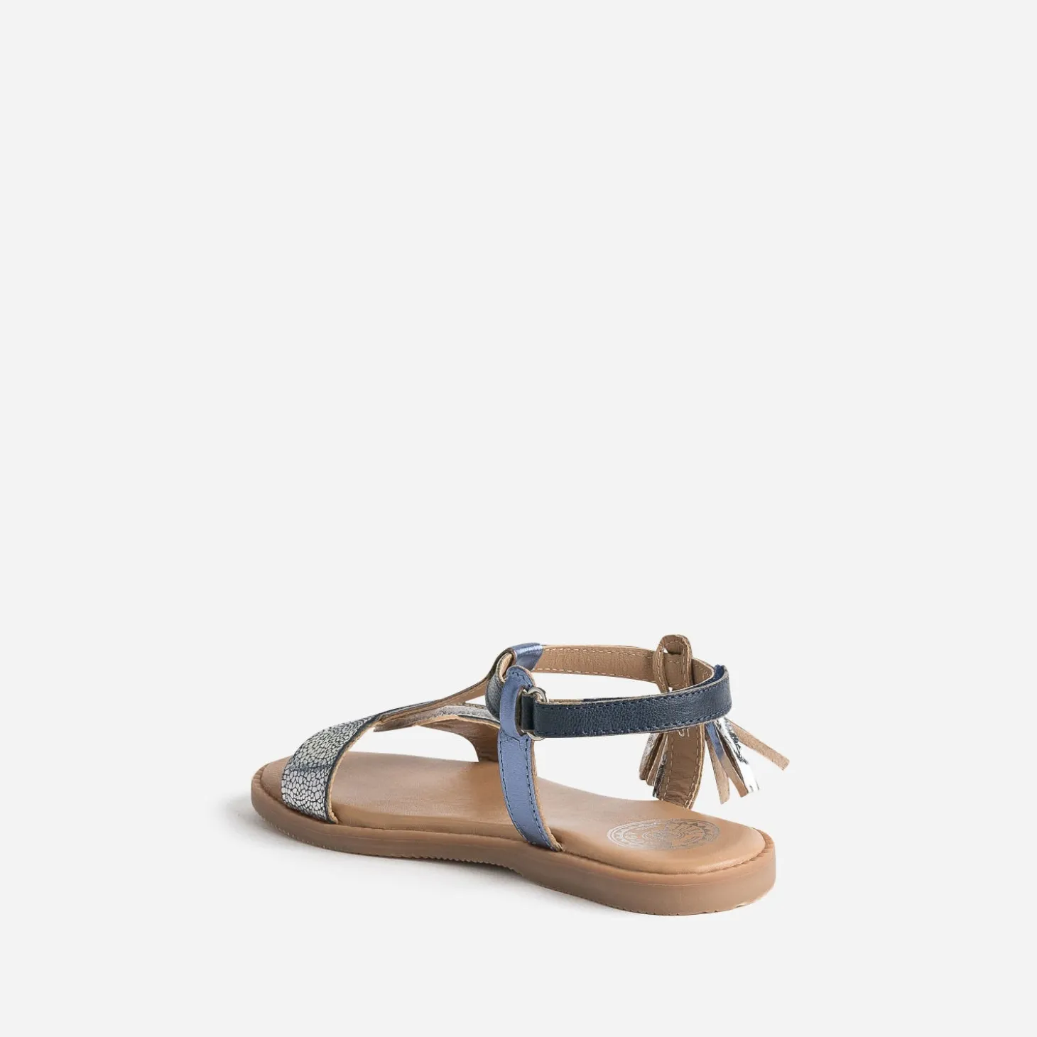 Bleu et argent, cette sandale fille se démarque par son cuir lisse avec finition métallisée. L’imprimé fantaisie et la double pampille sur le côté renforcent son style raffiné. Un modèle à oser avec une tenue de cérémonie comme avec un look plus décontracté.