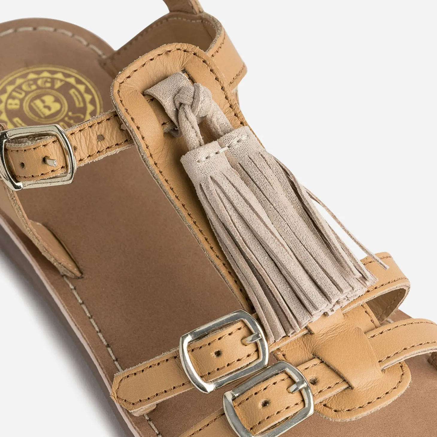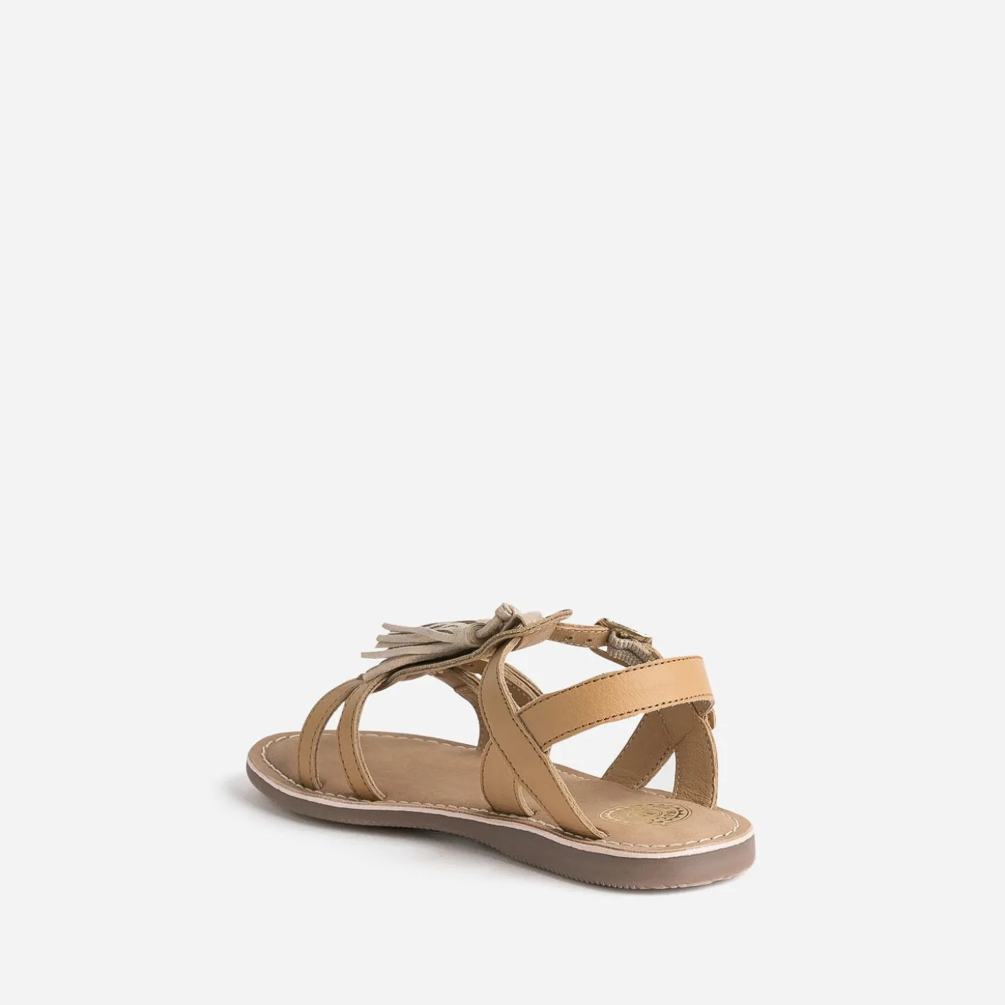 La sandale camel en cuir mise sur son élégance innée. La bride en T peut se décorer, ou pas, d’une longue pampille en cuir beige doré, rose ou turquoise avec touches métallisées, pour matcher avec ses tenues préférées.