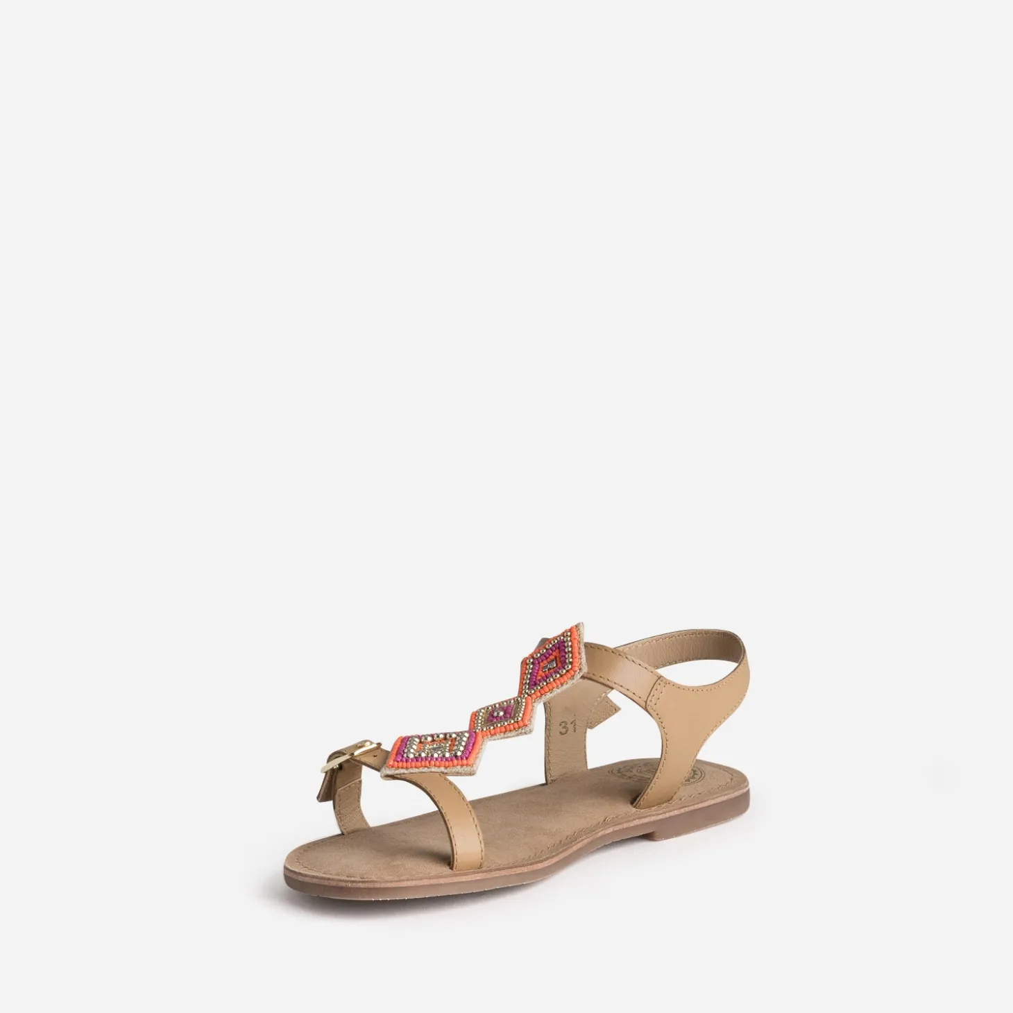 Broderies perles roses, orange fluo et dorées, sur la bride en T à 3 losanges, cette sandale fille adopte un style ethnique. En cuir beige foncé, elle se ferme par boucles, pour ajuster le confort et le maintien du pied. Imaginez-la avec une robe longue blanche ou un débardeur blanc et un short en jean bleu.