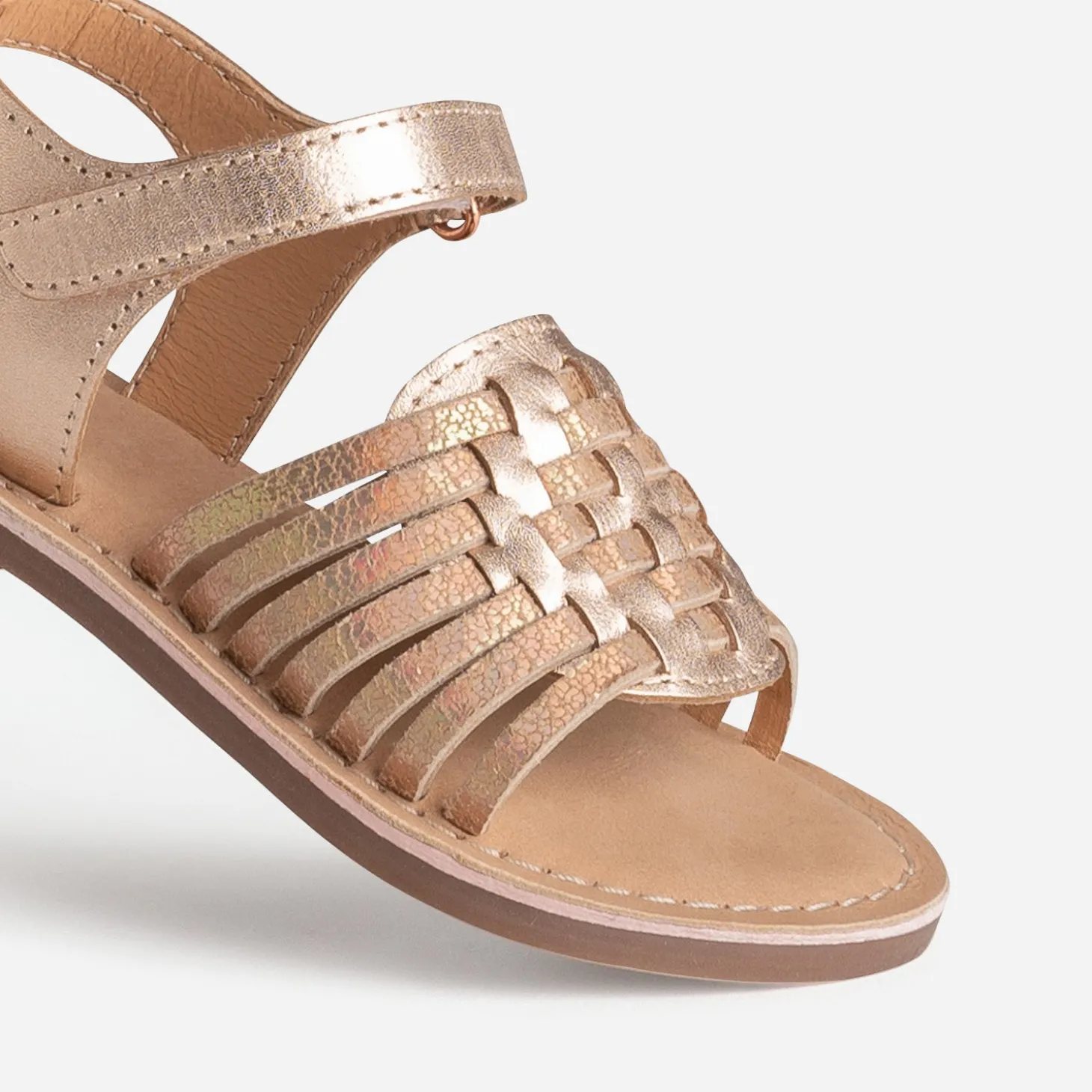 Concentré de style et de confort pour cette sandale pour petite fille. Le cuir métallisé rose cuivré s’invite sur les brides, qui s’offrent un tressage subtil sur le dessus du pied. Grâce à la fermeture par scratch, l’ajustement est simple et précis, même avec de petites mains. Un modèle polyvalent qui se marie à merveille avec une robe de cérémonie pastel pour un look élégant, ou avec un combi-short pour un style plus décontracté.