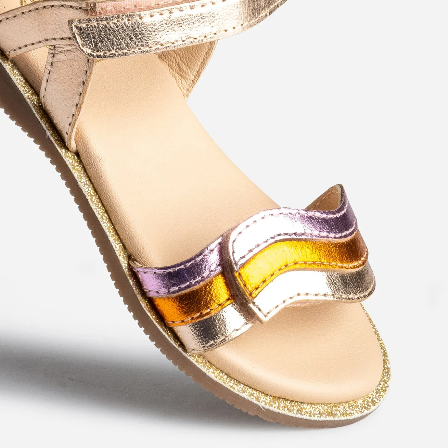 Les petites filles ont souvent des envies mode très ciblées : de la brillance et du doré. Cette sandale exauce tous leurs vœux : du cuir métallisé, une bride tricolore avec du rose vif et du orange, des paillettes sur la trépointe. Idéale pour une cérémonie, elle fonctionne aussi avec toutes ses robes d’été. Son scratch réglable à l’avant permet d’adapter la sandale à la morphologie du pied.