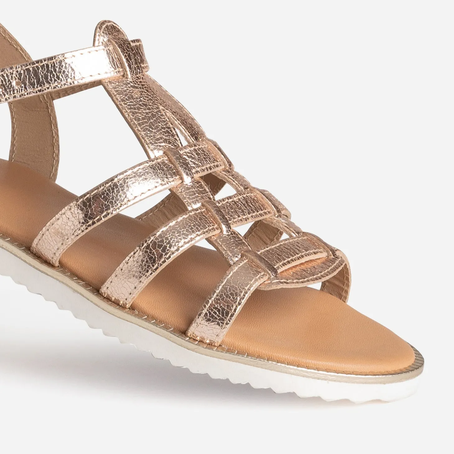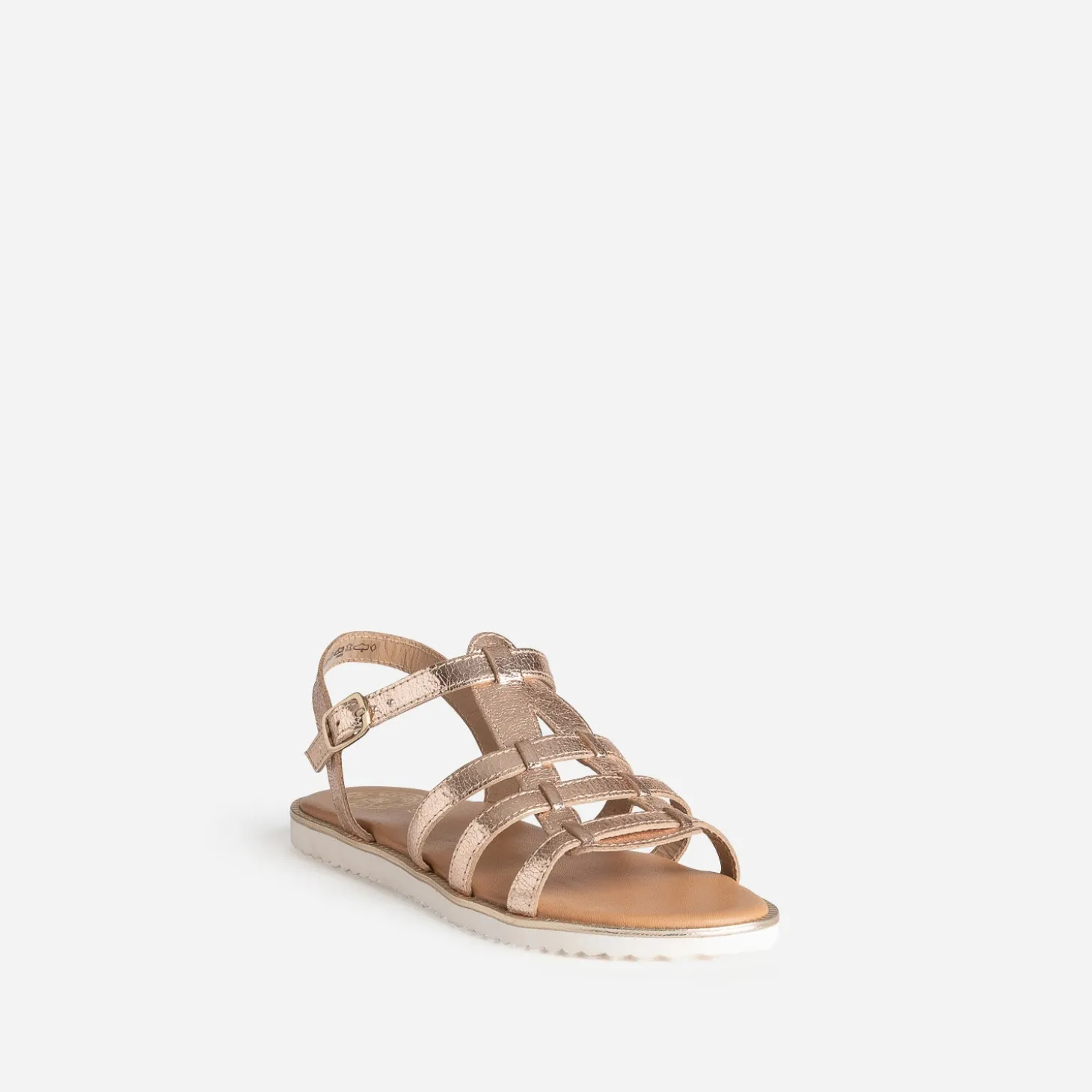 Inspiration spartiate pour cette sandale pour fille, identifiable à un jeu de brides spécifique. En cuir, elle se décline en coloris doré avec finition effet froissé, le tout monté sur une semelle crantée avec trépointe métallisée. Un modèle parfait, pour apporter une touche chic aux tenues quotidiennes.