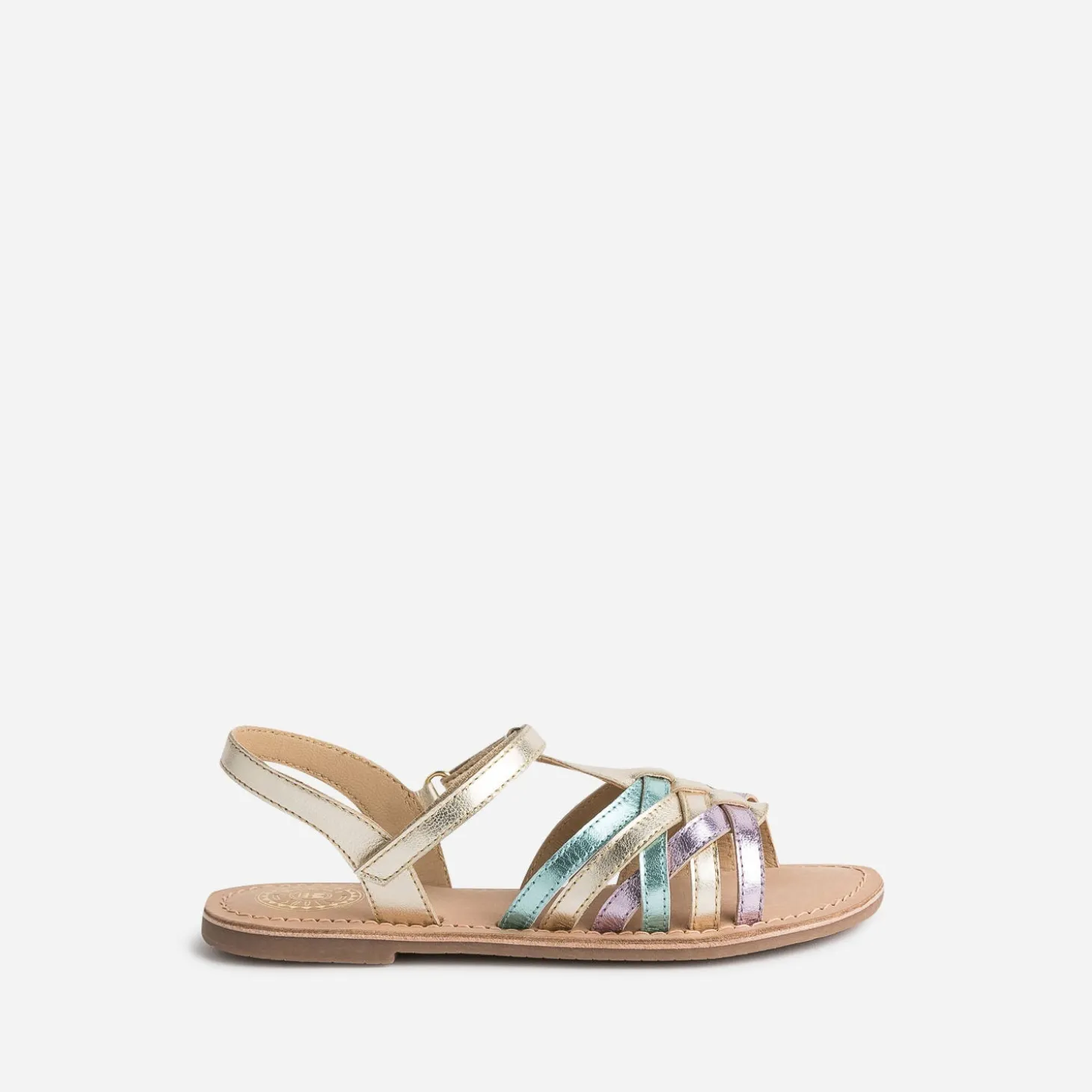 Le cuir métallisé a le pouvoir de sublimer chaque tenue d’une touche chic ; il habille cette sandale pour fille, dans les tons de doré, parme et vert, dans une belle harmonie. La fermeture par scratch facilite l’autonomie et permet ajustement, confort et maintien du pied. Un modèle à choisir pour une cérémonie, et à porter tout au long de la saison.