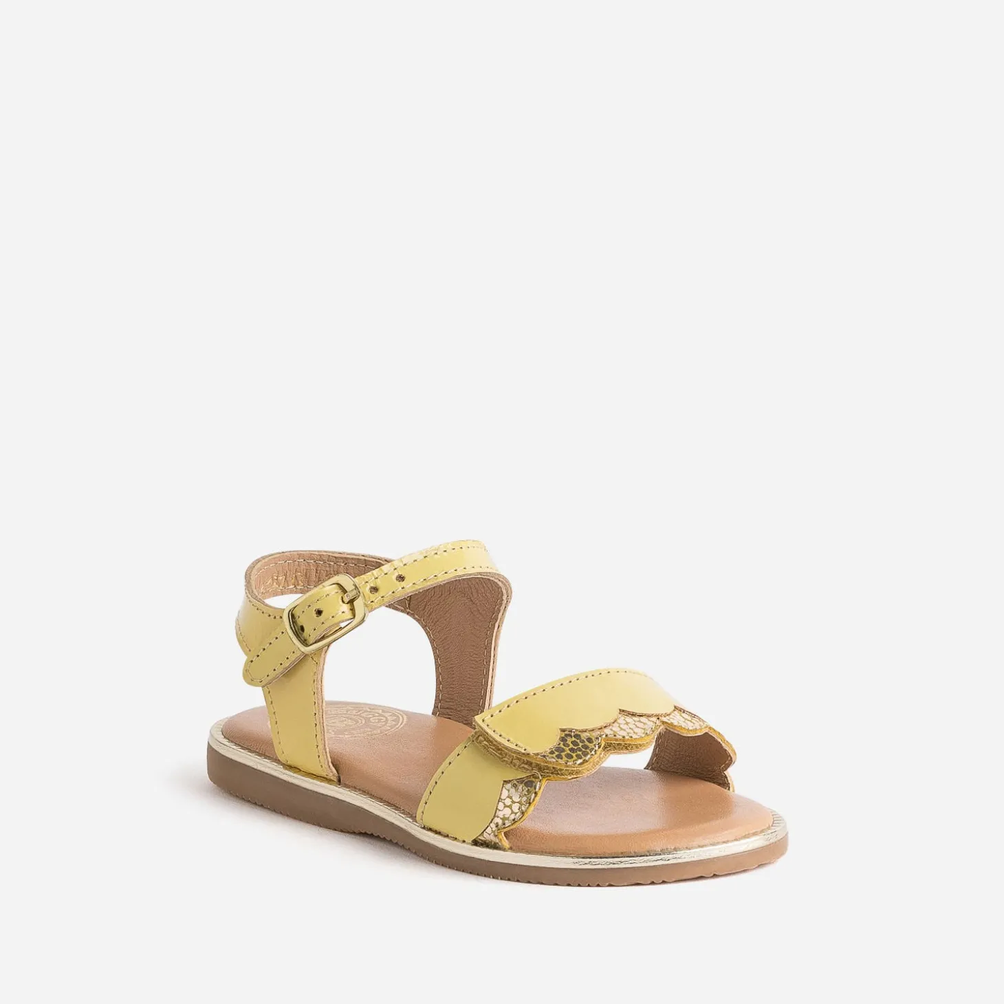 Vous cherchez le soleil ? Il est là. Juste à ses pieds. Dans une sandale en cuir jaune verni, bordé de doré, en écho à la trépointe. Sur la large bride, posée sur le dessus, des découpes vagues apportent un twist chic. Scratch et boucle s’associent pour maintenir parfaitement le pied. Un modèle à essayer avec un tee-shirt blanc et une robe salopette en jean bleu.