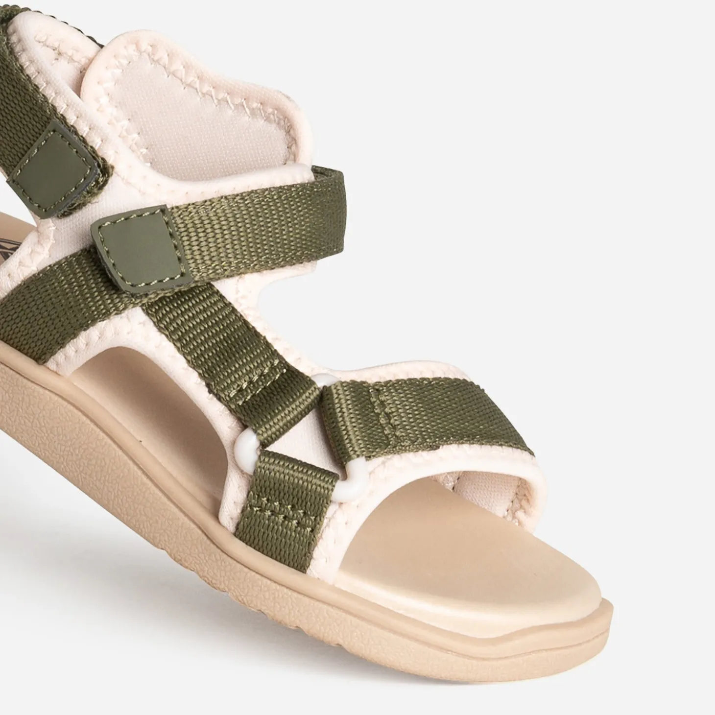 La sandale pour enfant se réinvente pour offrir un maximum de confort aux petits pieds. Par une matière textile souple, par des brides ajustables par scratchs, par une semelle moussée. Les galons se déclinent en coloris kaki sur fond beige. Un modèle inspiré du sport, pour poursuivre leurs aventures bien chaussés, tout au long de l’été.