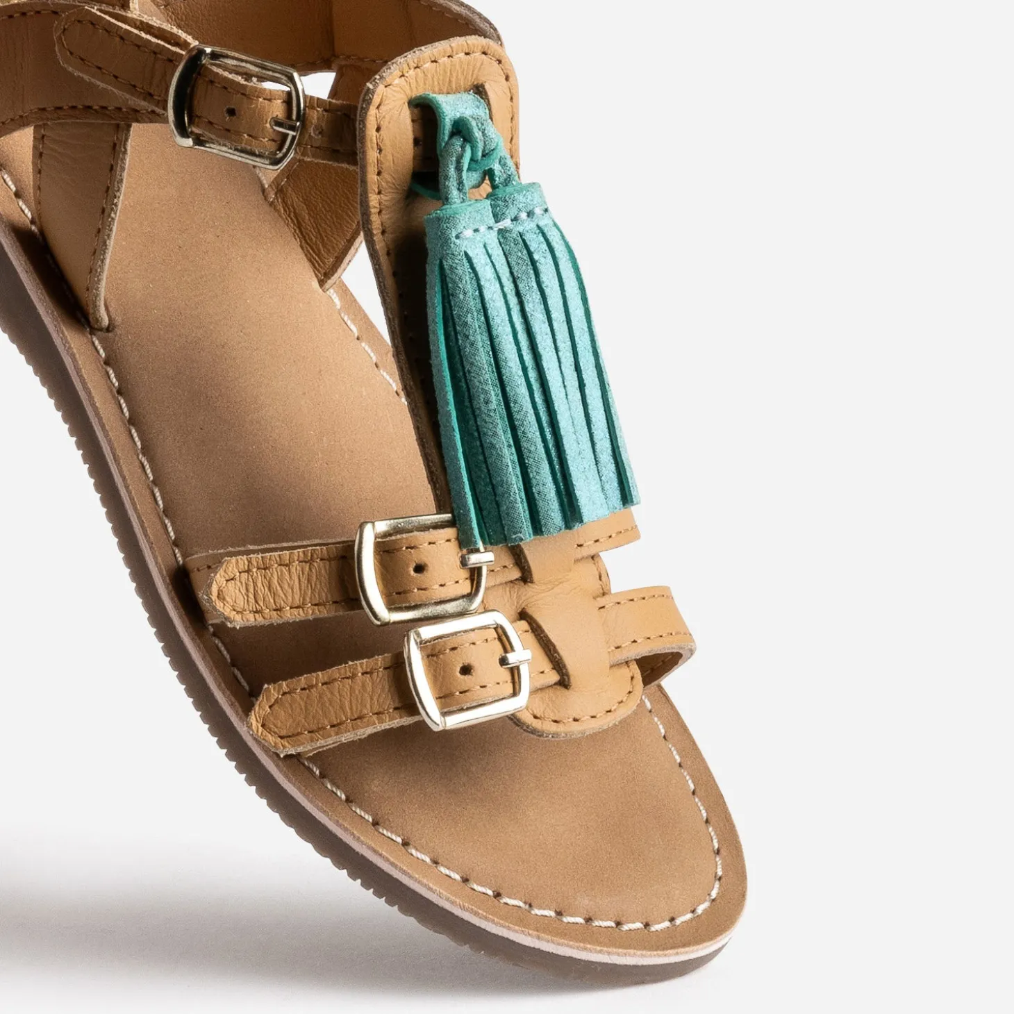 La sandale marron clair en cuir mise sur son élégance innée. La bride en T peut se décorer, ou pas, d’une longue pampille en cuir beige doré, rose ou turquoise avec touches métallisées, pour matcher avec ses tenues préférées.