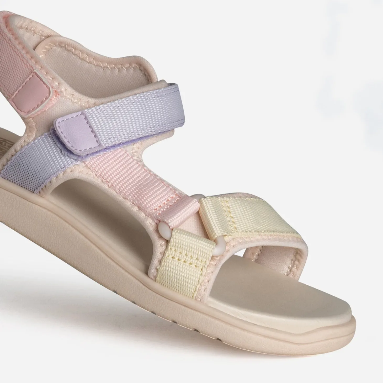 La sandale pour enfant se réinvente pour offrir un maximum de confort aux petits pieds. Par une matière textile souple, par des brides ajustables par scratchs, par une semelle moussée. Les galons se déclinent en couleur pastel, rose, parme et jaune clair, sur fond beige. Un modèle inspiré du sport, pour poursuivre leurs aventures bien chaussés, tout au long de l’été.