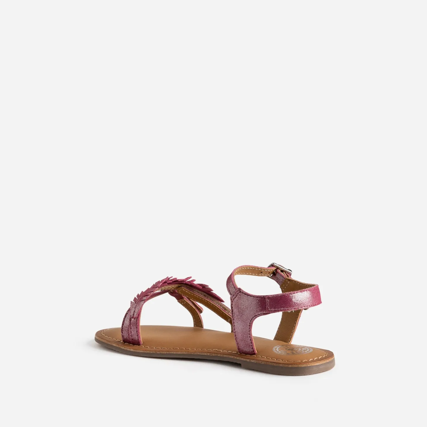 En cuir velours rose, avec finition irisée, cette sandale fille apporte une touche de couleur aux tenues. Construite avec 3 brides, elle est décorée d’une plume sur le dessus. Elle se ferme par boucles, à ajuster en fonction de la largeur du pied.