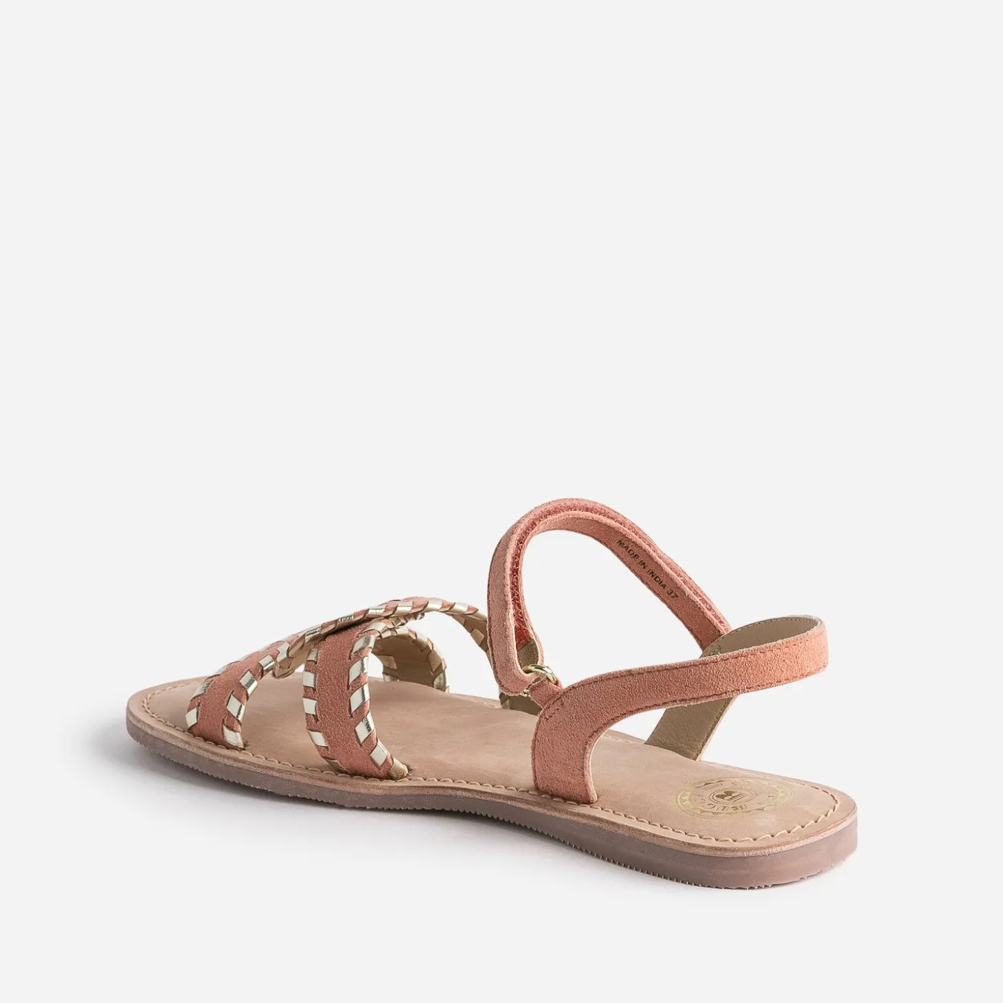 Cette sandale junior fille séduit par le cuir velours et le coloris rose saumon, par les brides croisées sur le dessus du pied et le tressage doré. Elle se ferme par un scratch, à ajuster en fonction du cou-de-pied. A associer avec des teintes pastel, amande, jaune ou ciel.