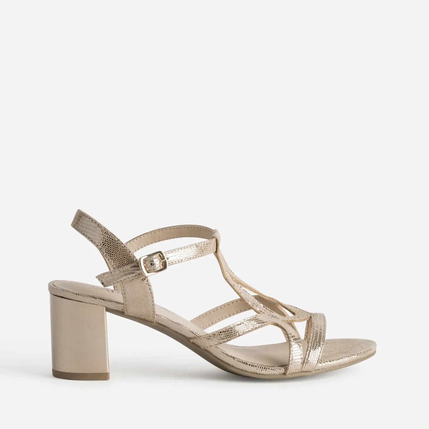 Place à l’été avec une nouvelle sandale empreinte de féminité. Laissez-vous séduire par la souplesse incroyable de son cuir, avec doublure synthétique et semelle première en cuir. Montée sur un talon de 6 cm, elle joue avec des fines brides, rythmées par des touches brillantes, résultat d’un effet python. Son coloris doré, chic et élégant, s’adapte facilement à toutes les tenues.