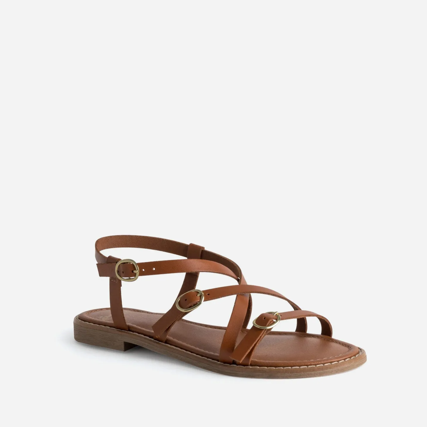 Un jeu de lanières sophistiqué. Une teinte chaleureuse et intemporelle. La sandale plate pour femme reste une valeur sûre, qui traverse les étés. En cuir cognac, elle maintient le pied par un jeu de fines brides et de boucles en métal doré. Un modèle rassurant, avec une robe longue, en jersey de couleur, à nouer sur le côté.