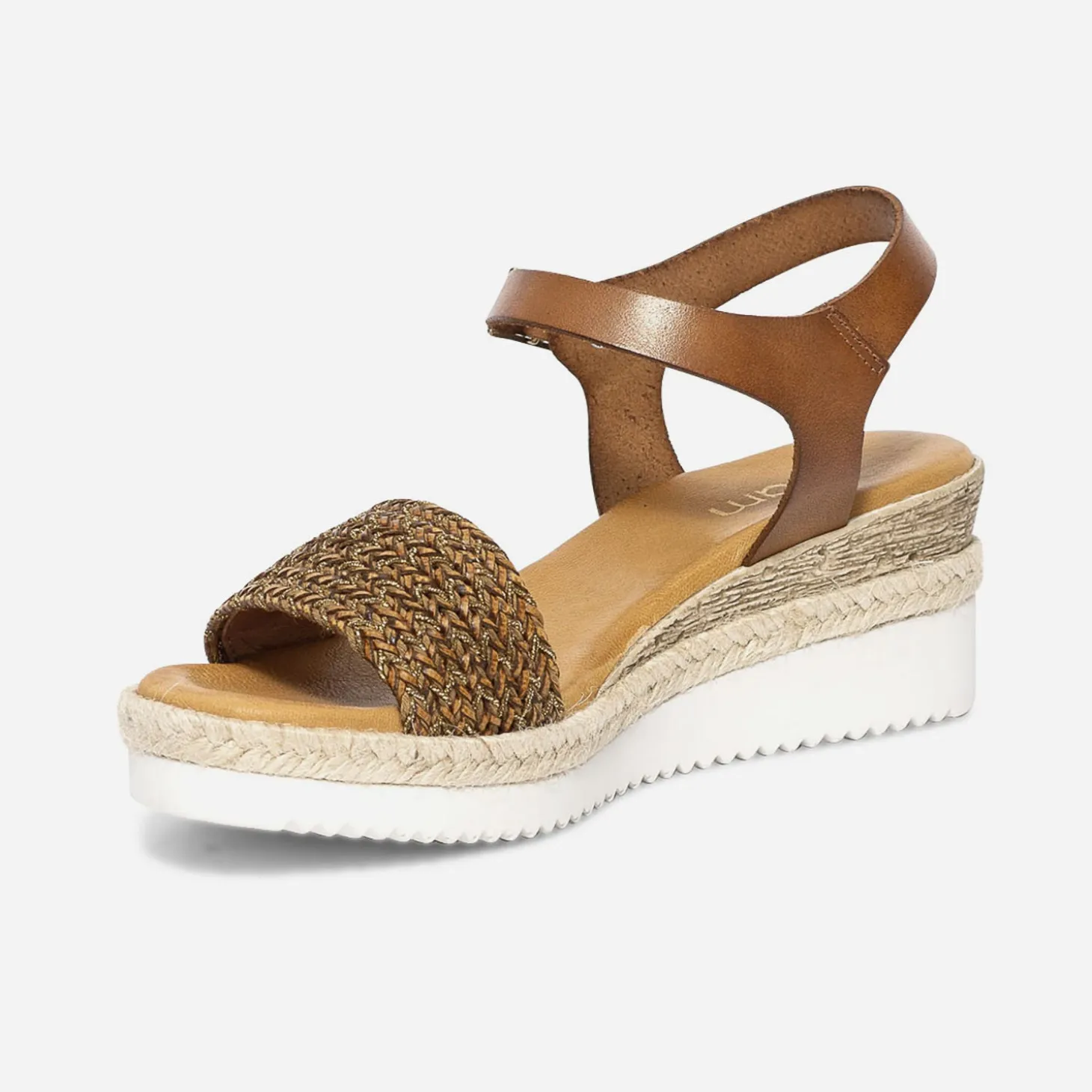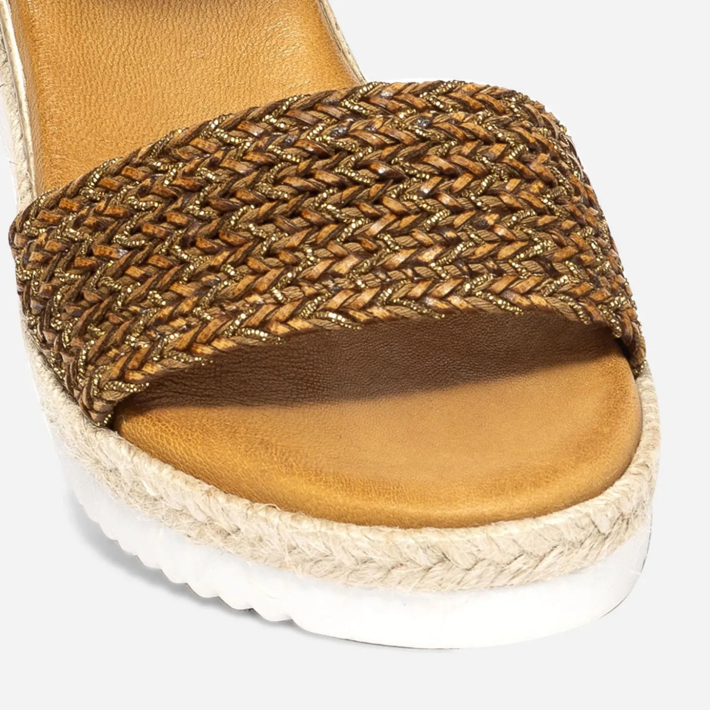 L’allure bohème se modernise, ouvrant encore le champ des possibles. Cette sandale femme est montée sur un talon compensé de 6 cm, superposant une semelle crantée blanche, une tresse en corde et une matière synthétique fantaisie. En cuir cognac, elle présente une large et unique bride tressée et ponctuée de fils dorés. Son atout, c’est sa première moussée en cuir, au confort incroyable. Associez-la à des tons de beige, camel, marine ou kaki, sans préférence.