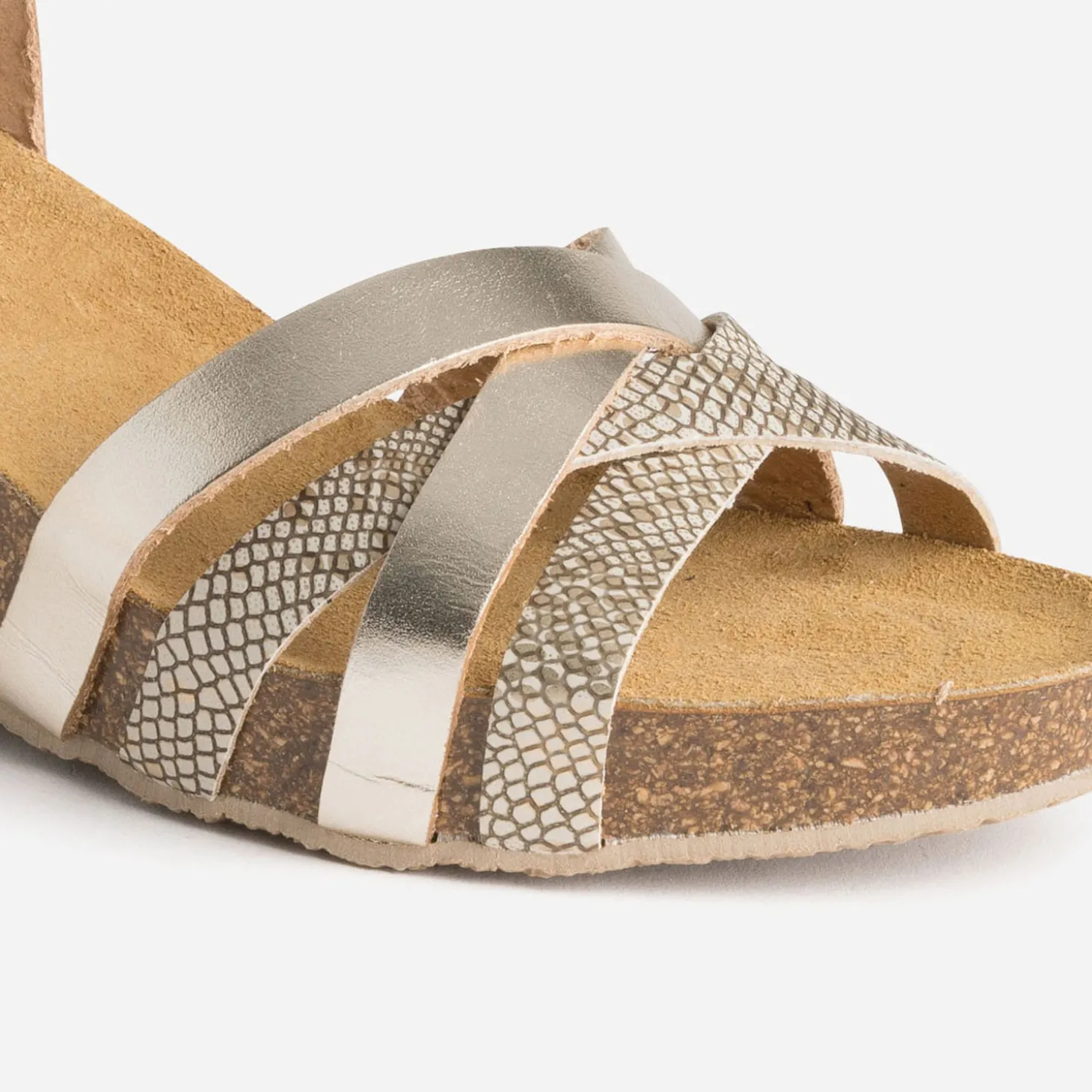 Cette sandale anatomique en cuir velours, c’est la promesse d’un confort sans égal. Montée sur un talon compensé, cette sandale pour femme multiplie les brides dorées, en cuir lisse ou à imprimé effet python. Portez-la avec une tenue décontractée dans les tons blanc, beige ou gris clair.