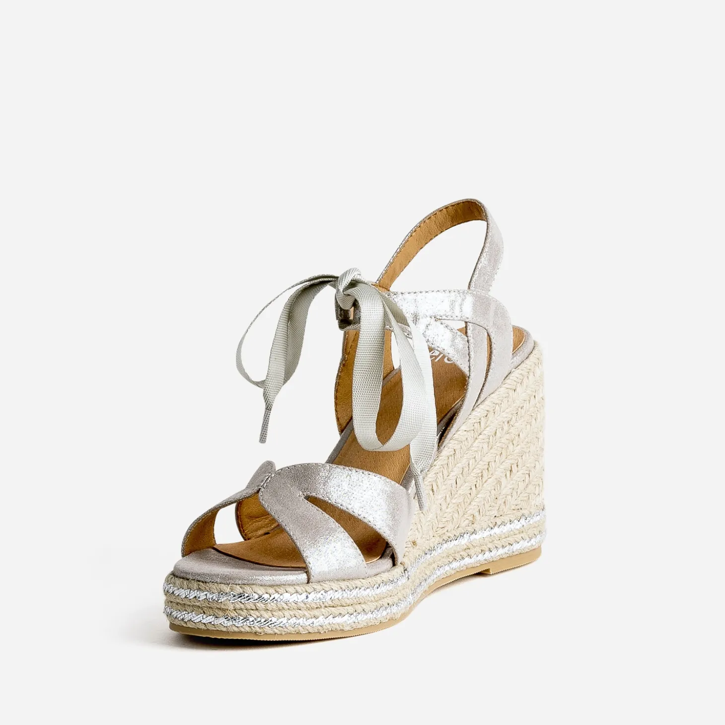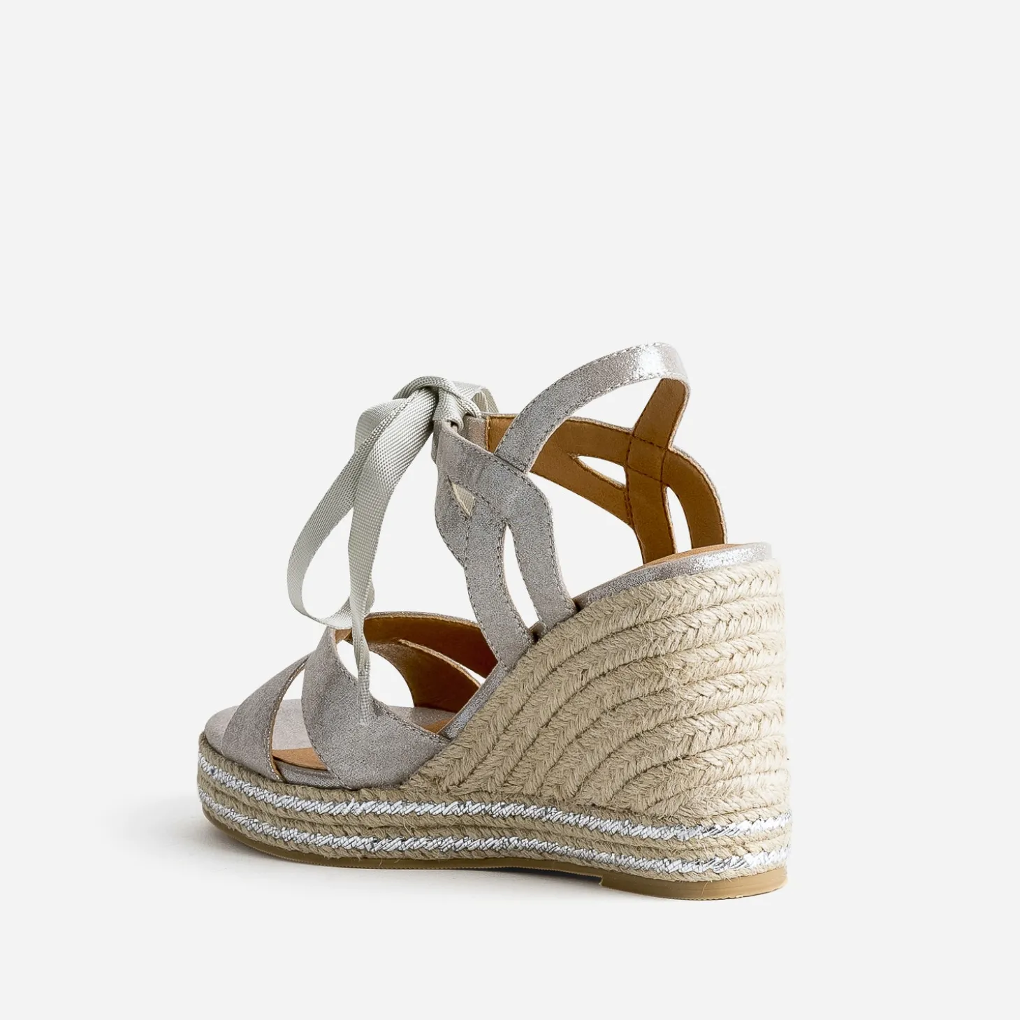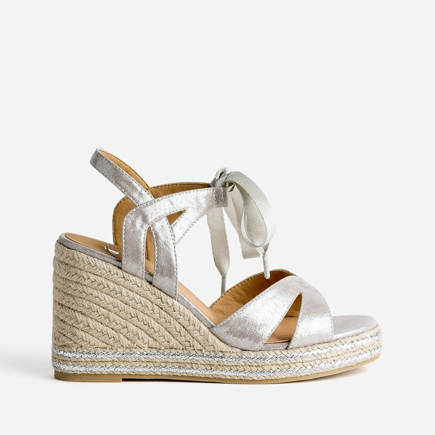Sublime textile argenté irisé sur talon compensé, faites le show avec cette sandale femme. Jeu de brides et fermeture par lacet-ruban gris, elle allonge la silhouette de plus de 9 cm. Un modèle à préférer avec des nuances de gris, de bleus ou de violet.