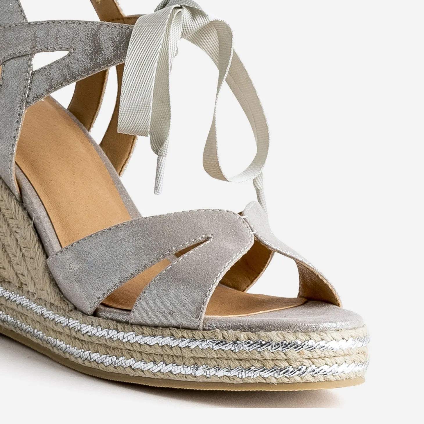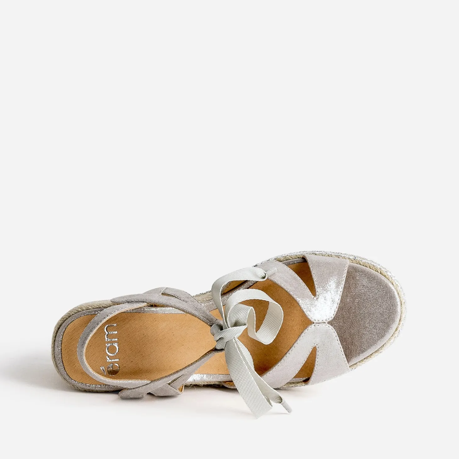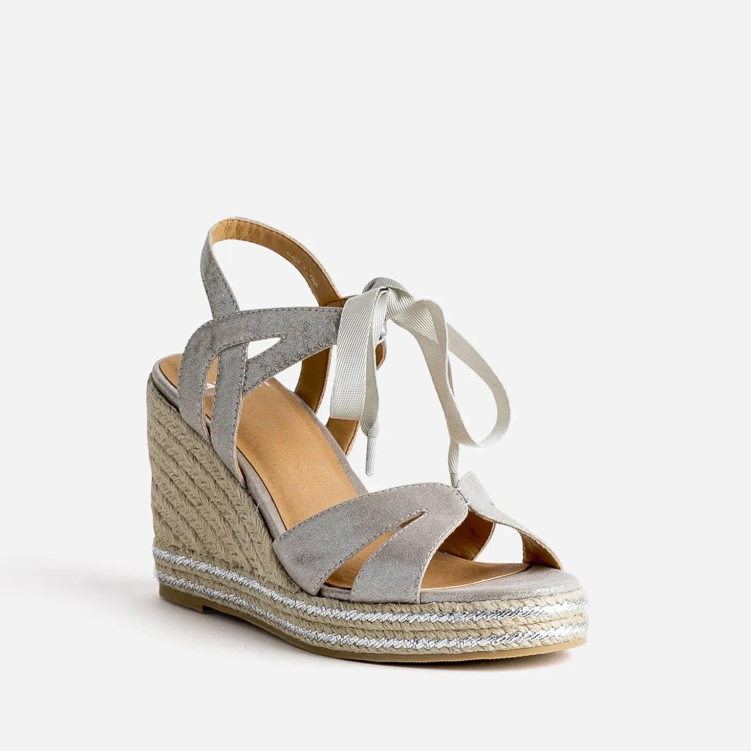 Sublime textile argenté irisé sur talon compensé, faites le show avec cette sandale femme. Jeu de brides et fermeture par lacet-ruban gris, elle allonge la silhouette de plus de 9 cm. Un modèle à préférer avec des nuances de gris, de bleus ou de violet.