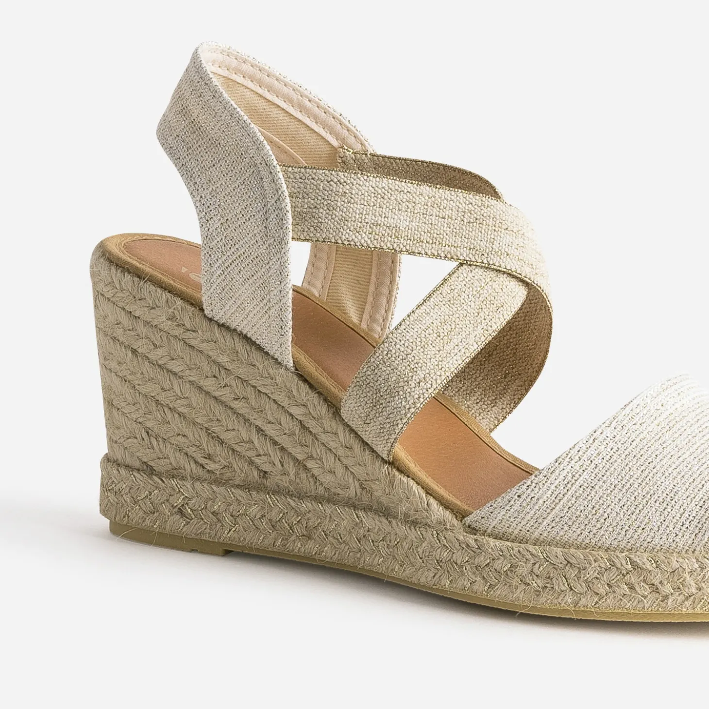 Si, le matin, vous n’avez pas une minute à perdre, cette sandale femme est faite pour vous. D’abord, parce qu’elle maintient le pied par deux larges brides croisées élastiquées. Une grande facilité. Ensuite, parce qu’elle est montée sur une semelle en corde compensée. Un confort inégalé. Enfin, parce qu’elle se décline en coloris beige, avec touches dorées. Une élégance innée. En robe robe ou fleurie, en chemise sur jean brut, voire en combi, vous n’allez plus les quitter.