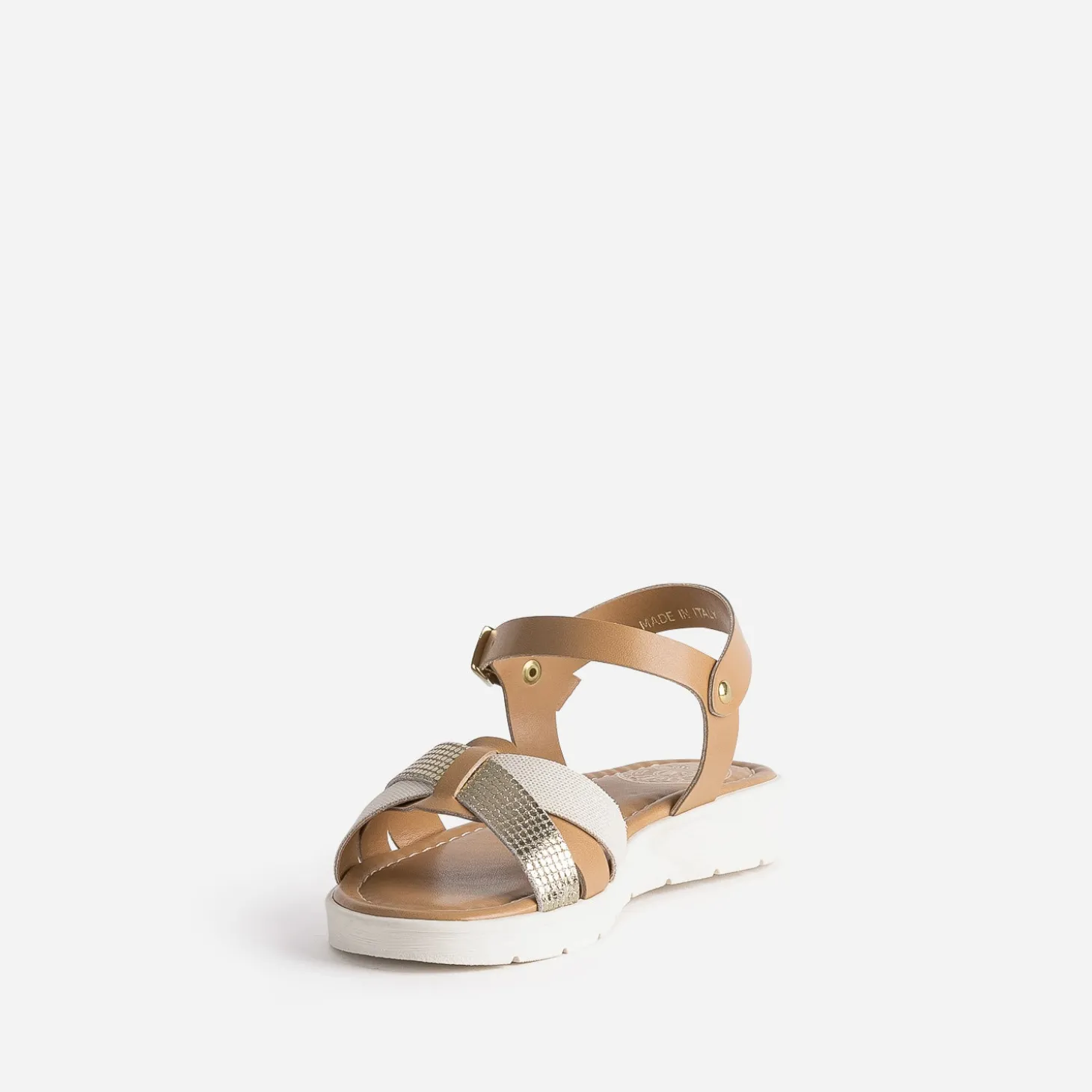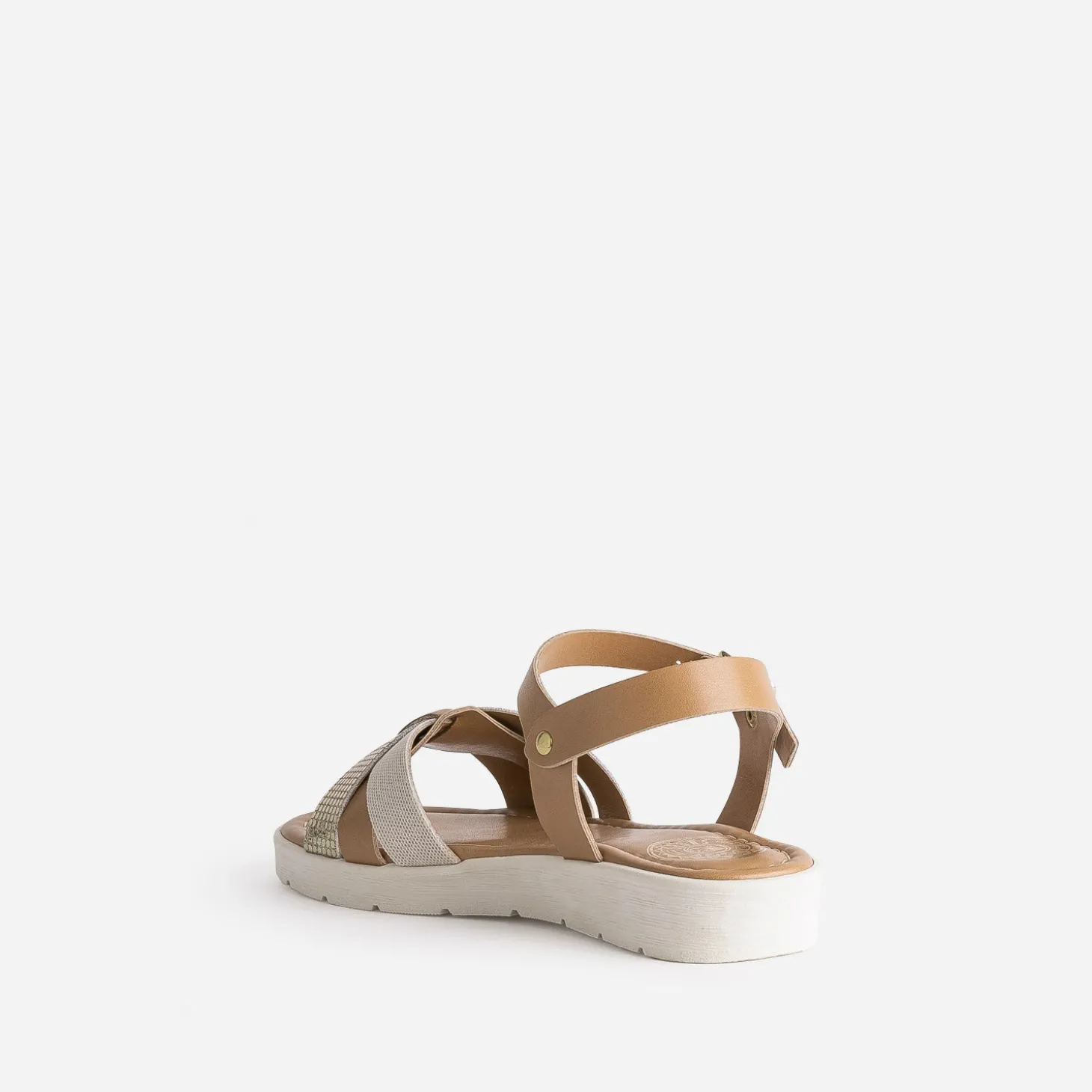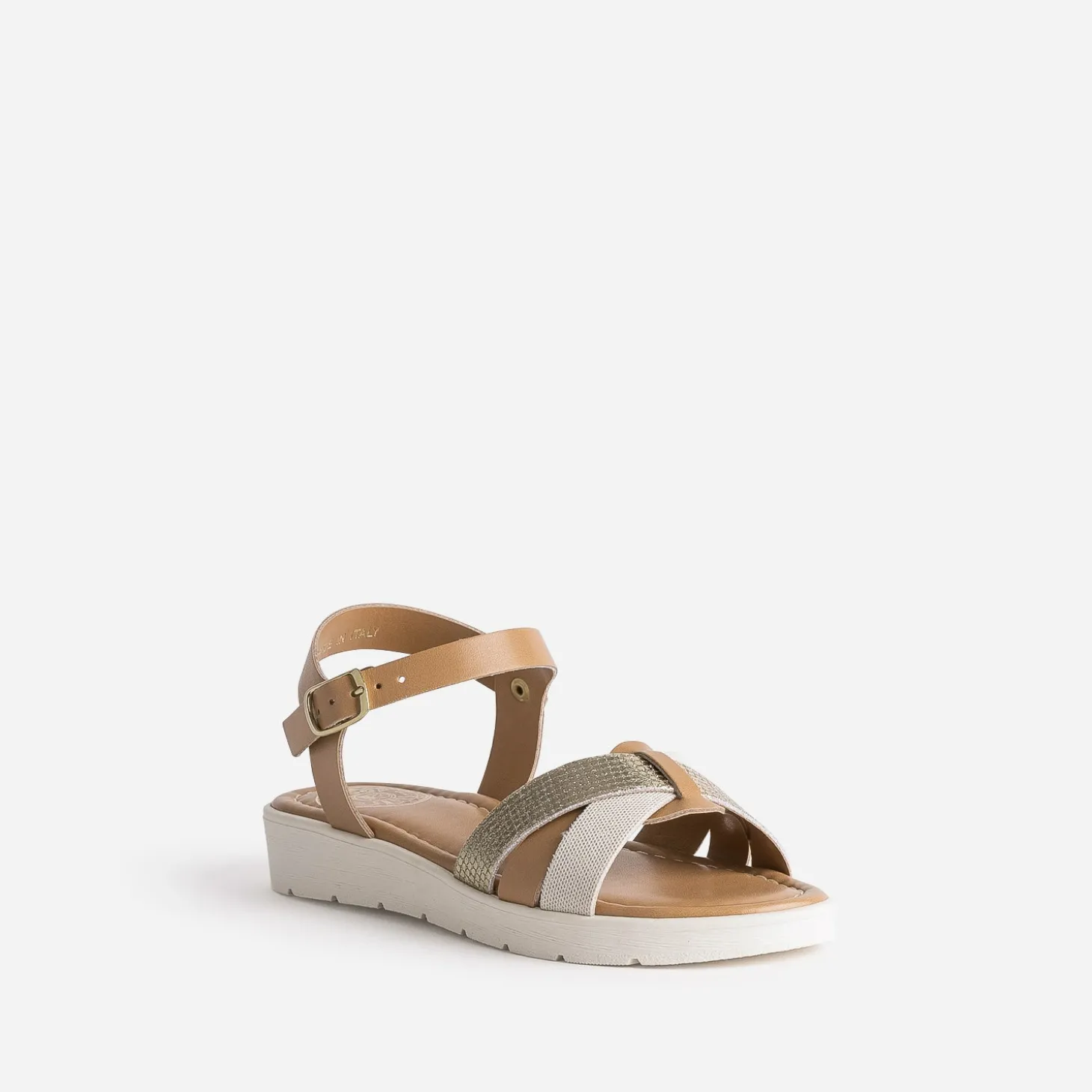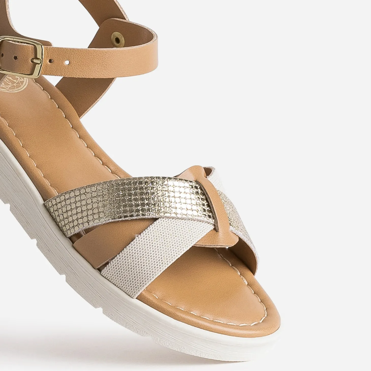 Camel et doré est un combo à ne pas négliger, notamment en été. La preuve : il sublime cette sandale pour fille, par un jeu de brides croisées sur le dessus du pied. Pour une cérémonie, comme au quotidien, elle s’accorde avec tout, avec une incroyable facilité.