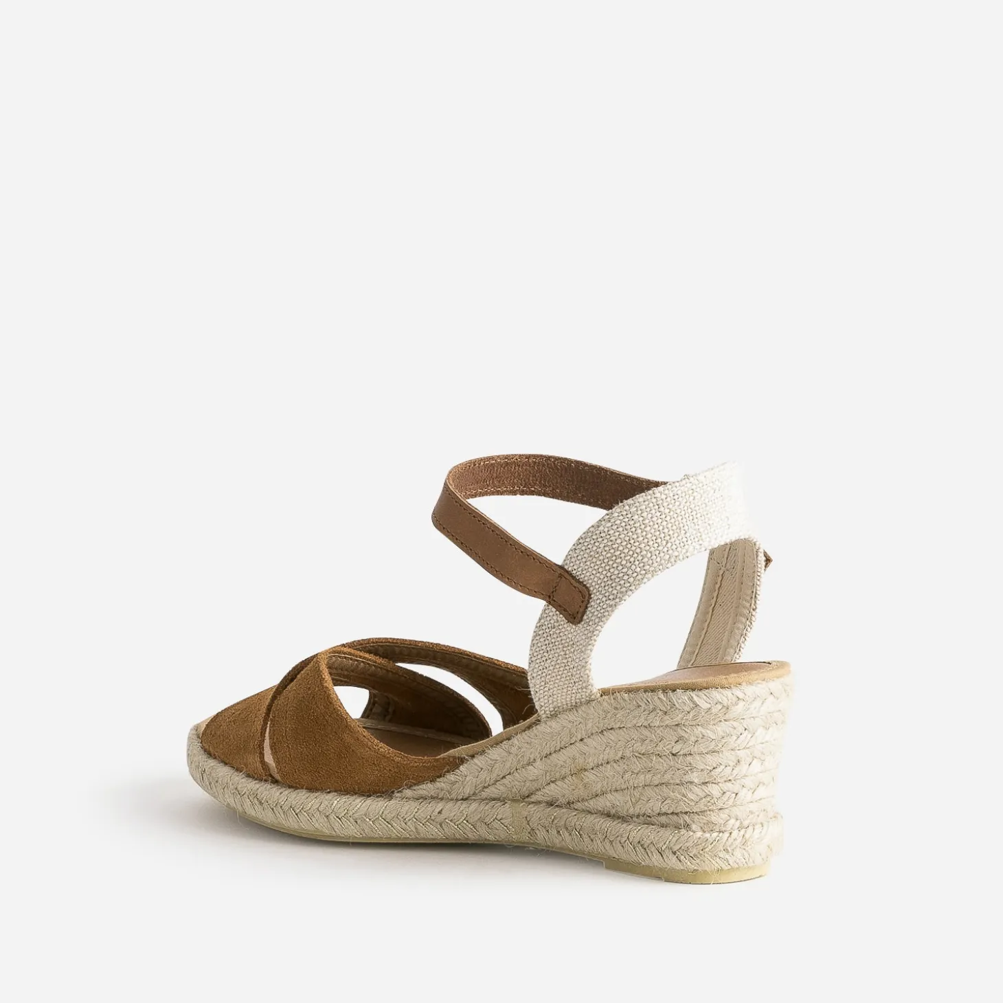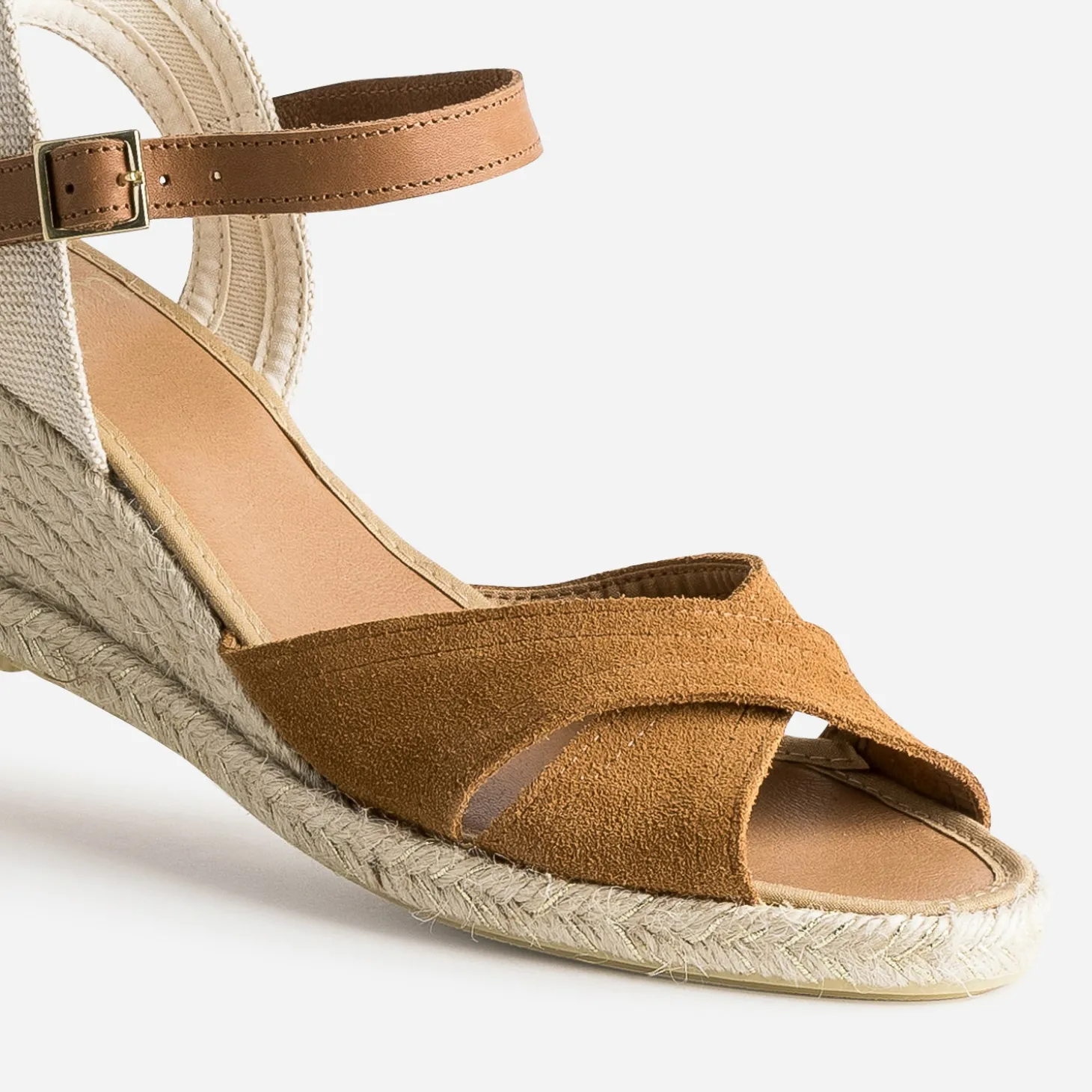 L’espadrille compensée est un modèle idéal pour le changement de saison. Portée pieds nus, elle maintient le pied par deux brides croisées en cuir velours camel. Le talon de 6 cm est entièrement recouvert de corde naturelle, et une bride lisse camel vient maintenir la cheville. Abusez-en dès le printemps, avec toutes les couleurs, du marine au beige, en passant par le rose ou le vert.