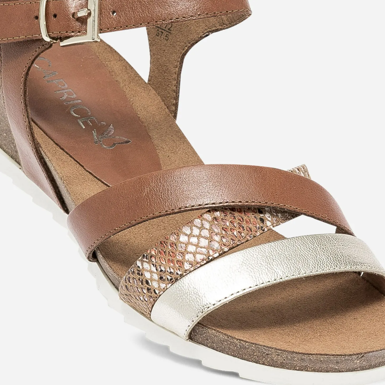 Spécialiste du bien-être, la marque CAPRICE propose des chaussures au confort incomparable. Place à l’été avec une nouvelle sandale toujours plus féminine. Laissez-vous séduire par la souplesse incroyable de son cuir, avec doublure et semelle première en matière synthétique. Coloris cognac, elle présente 3 brides à l’avant du pied, dont une à imprimé effet python et une dorée avec effet métallisé. Alliance du confort et de l’élégance, son petit talon compensé de 3,5 cm, associé à sa semelle antidérapante souple, offrent une stabilité parfaite.