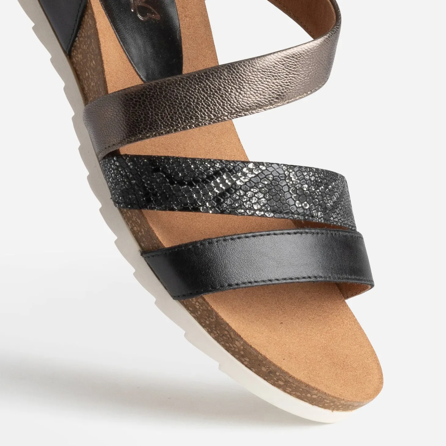 Dessus cuir, doublure cuir et semelle première en cuir, cette sandale pour femme se montrera très vite indispensable au quotidien. A dominante noire, elle présente 3 brides, noir, bronze lisse et noir irisé embossé effet python, à l’avant du pied. Alliance du confort et de l’élégance, son petit talon compensé, associé à sa semelle antidérapante souple, offrent une stabilité parfaite.