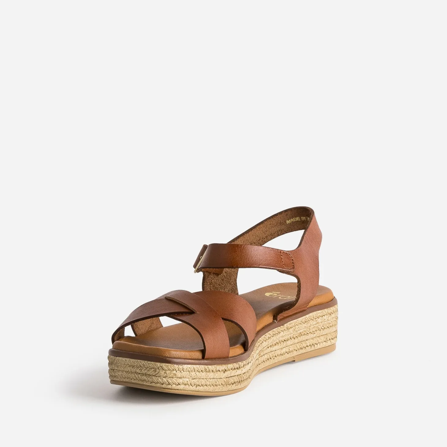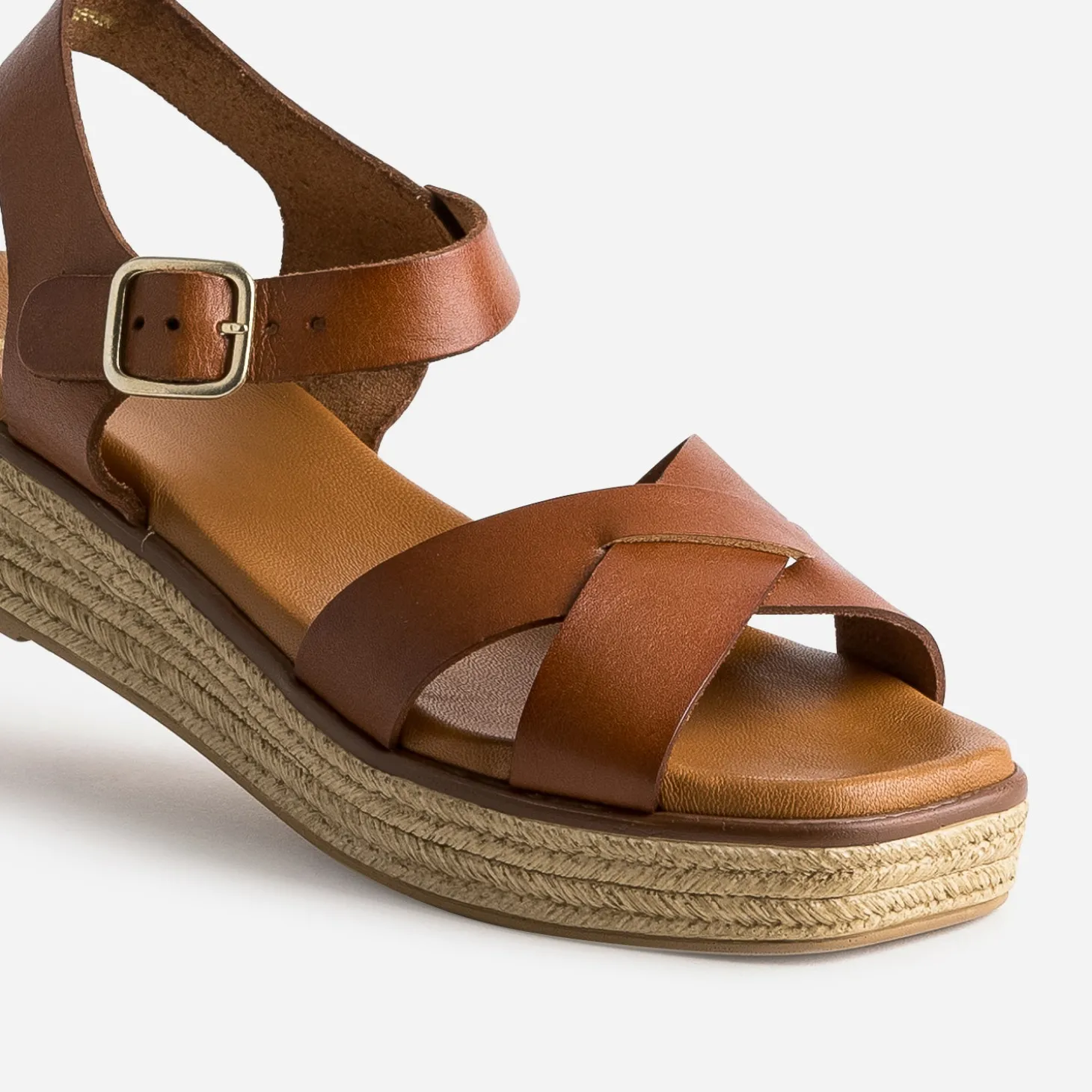 Montée sur une semelle imitation corde légèrement compensée, associée à une semelle première moussée, cette sandale femme mérite d’être essayée pour vous rendre compte de son confort. Les brides, en cuir cognac, se croisent sur le dessus et se ferment par une boucle sur la cheville. Privilégiez-la avec une tenue décontractée.