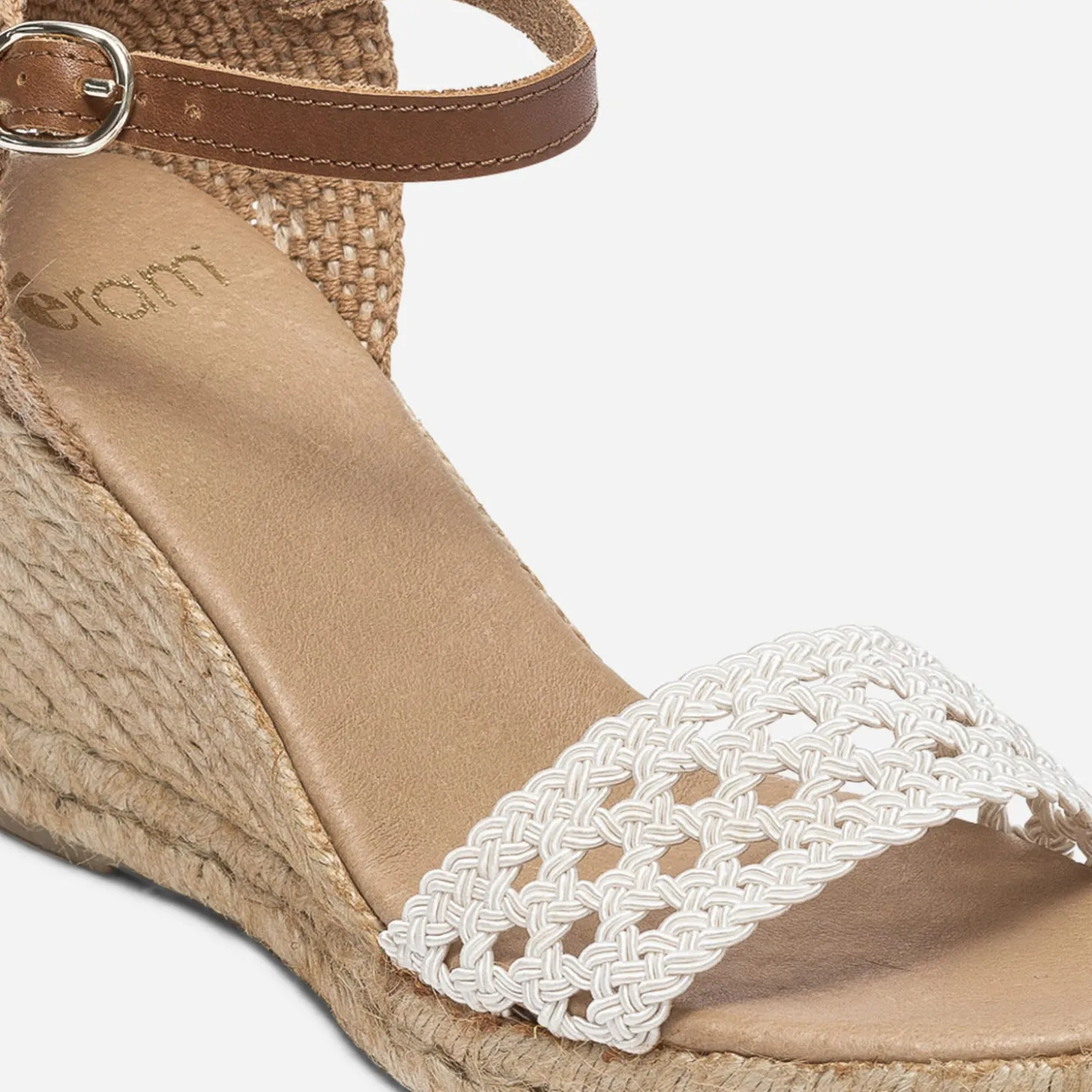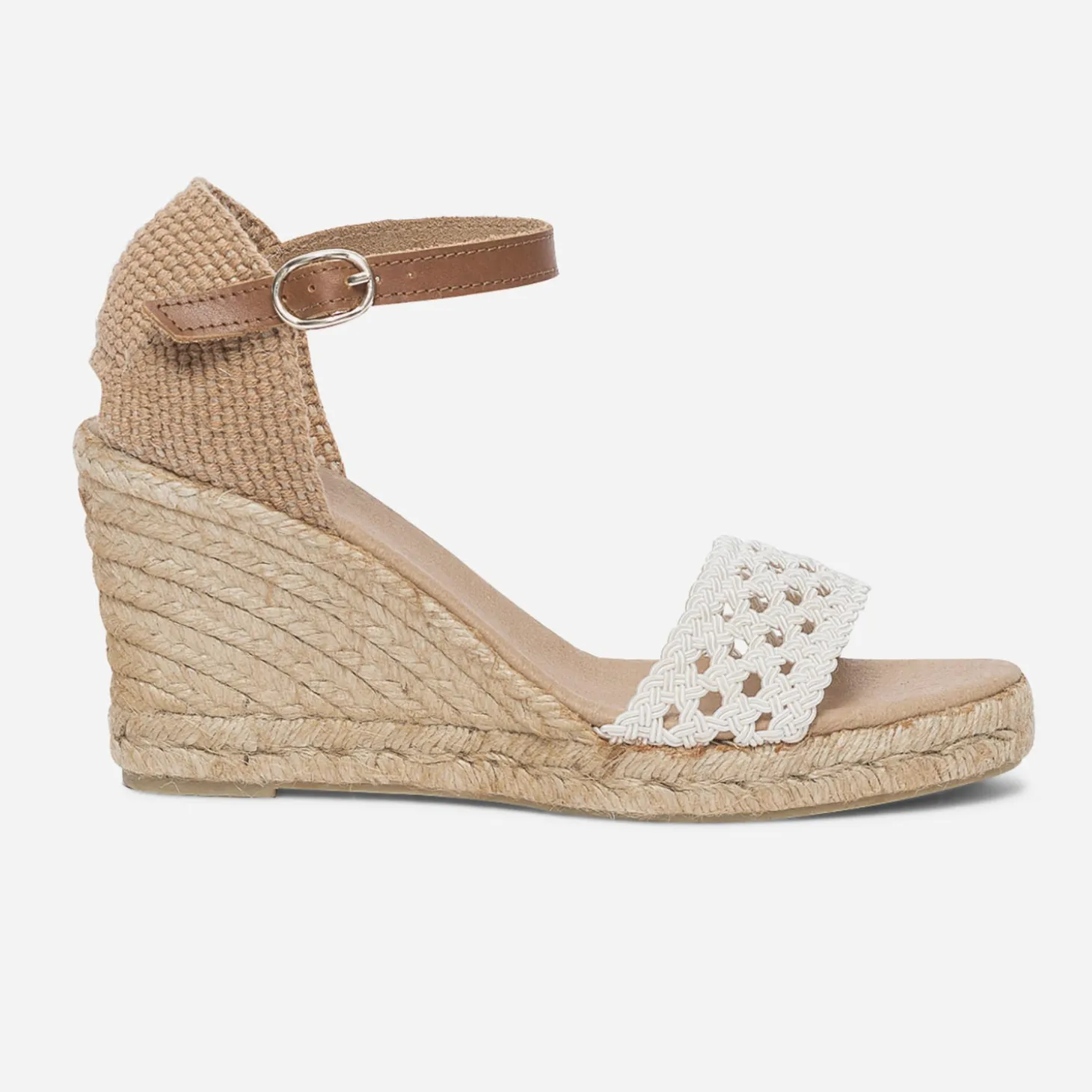L’esprit croisière anime cette sandale compensée pour femme. Montée sur un talon en corde de 9 cm, avec patin avant de 2 cm, elle maintient le pied, à l’avant par une large bride écrue tressée, à l’arrière par une tige souple en coton biologique certifié GOTS marron, à la cheville par une bride synthétique camel. Un modèle à porter avec un tailleur-short ou bermuda, en lin, dans des teintes naturelles ou pastel.