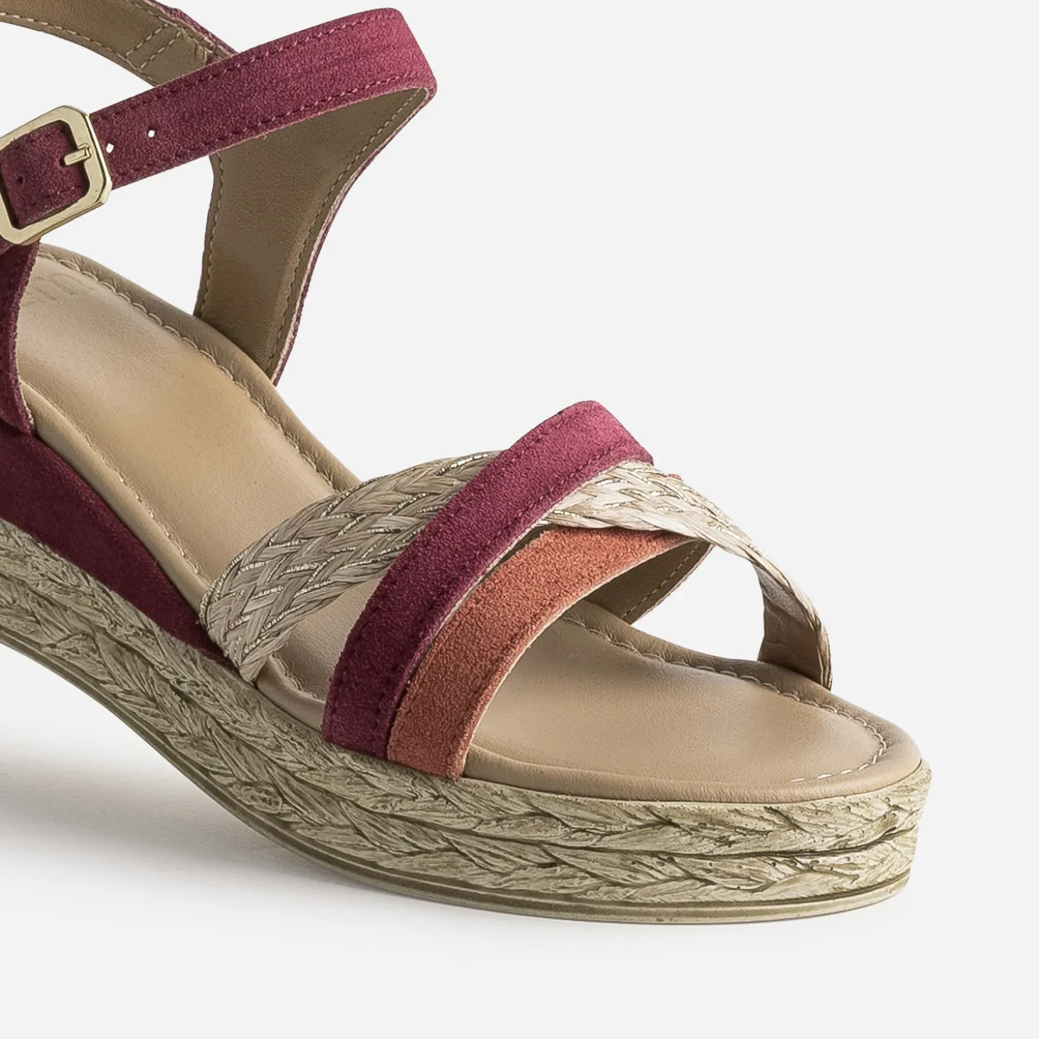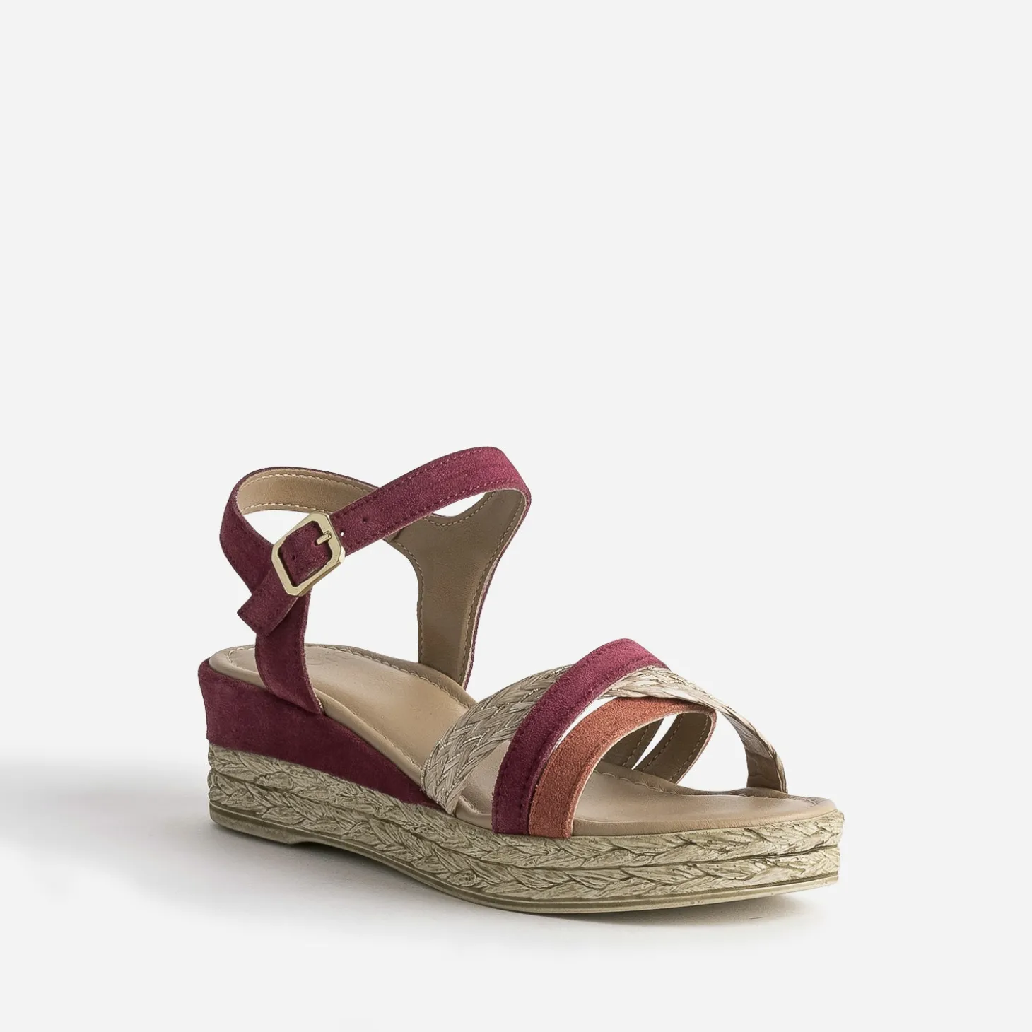 La fantaisie rythme nos chaussures d’été préférées ! Cette sandale femme ne fait pas exception. Montée sur une semelle compensée imitation corde, elle présente des brides de matières et de couleurs différentes, cuir velours prune et rouge et raphia beige, qui s’accordent dans une belle harmonie. Un modèle facile à porter au quotidien, avec, par exemple, des pièces en lin.