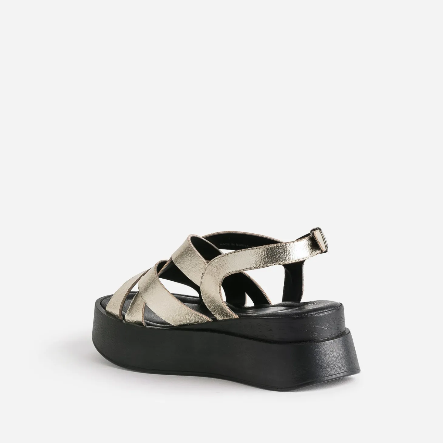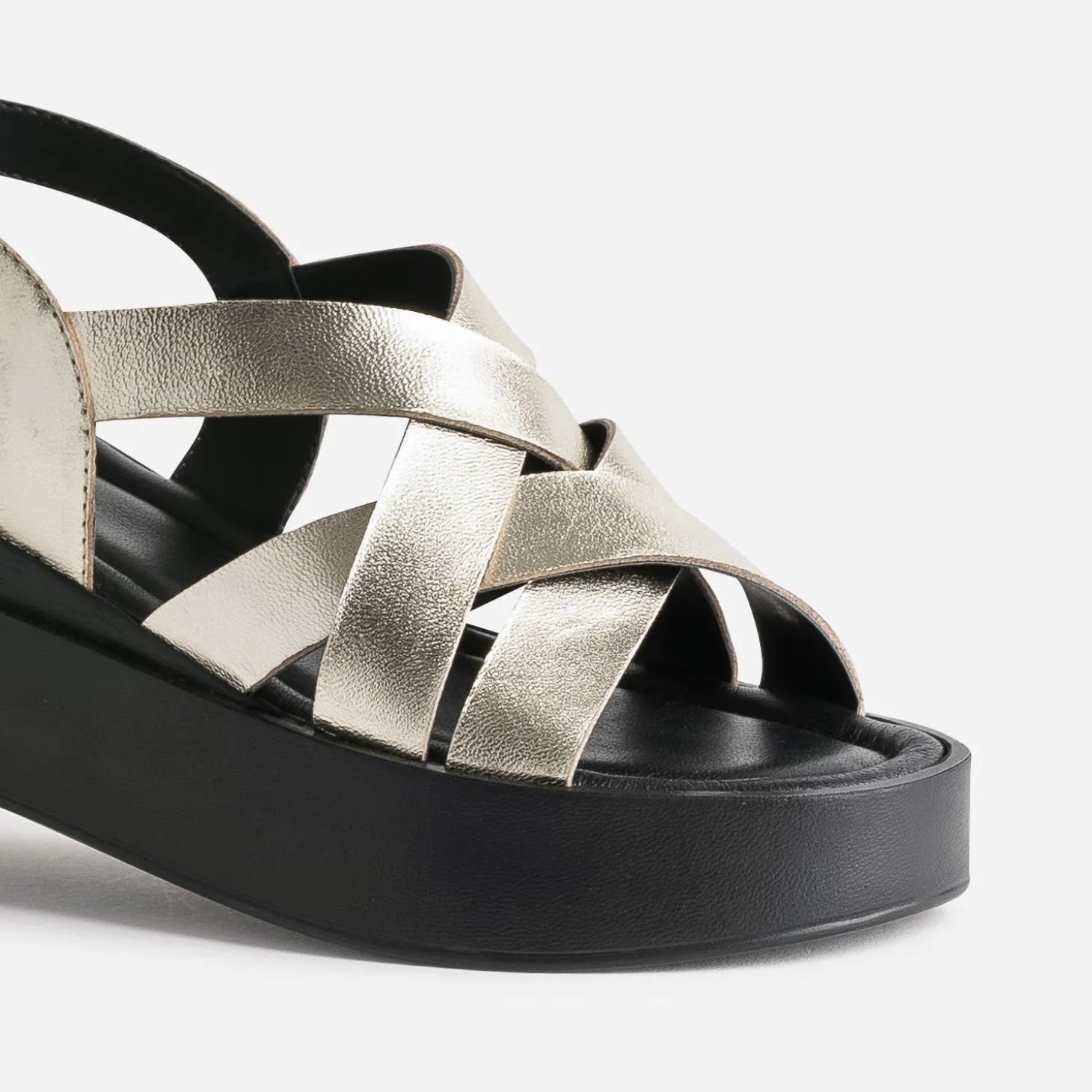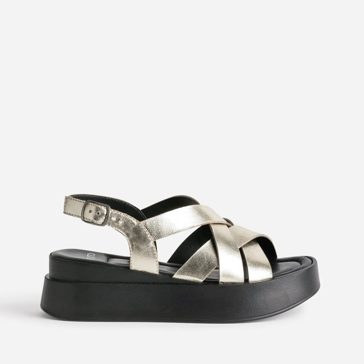 Brides croisées en cuir doré sur maxi semelle noire compensée : cette sandale pour femme s’annonce comme une pépite de la saison. Préférez-la avec un look s’autorisant des pièces à volume : sweat, top loose, pantalon large.