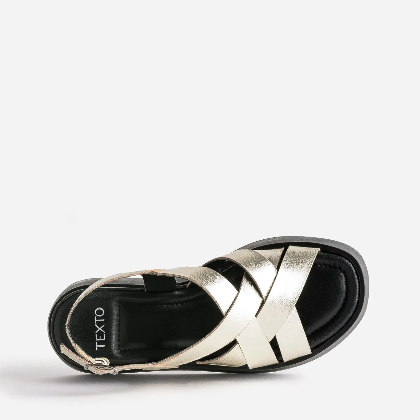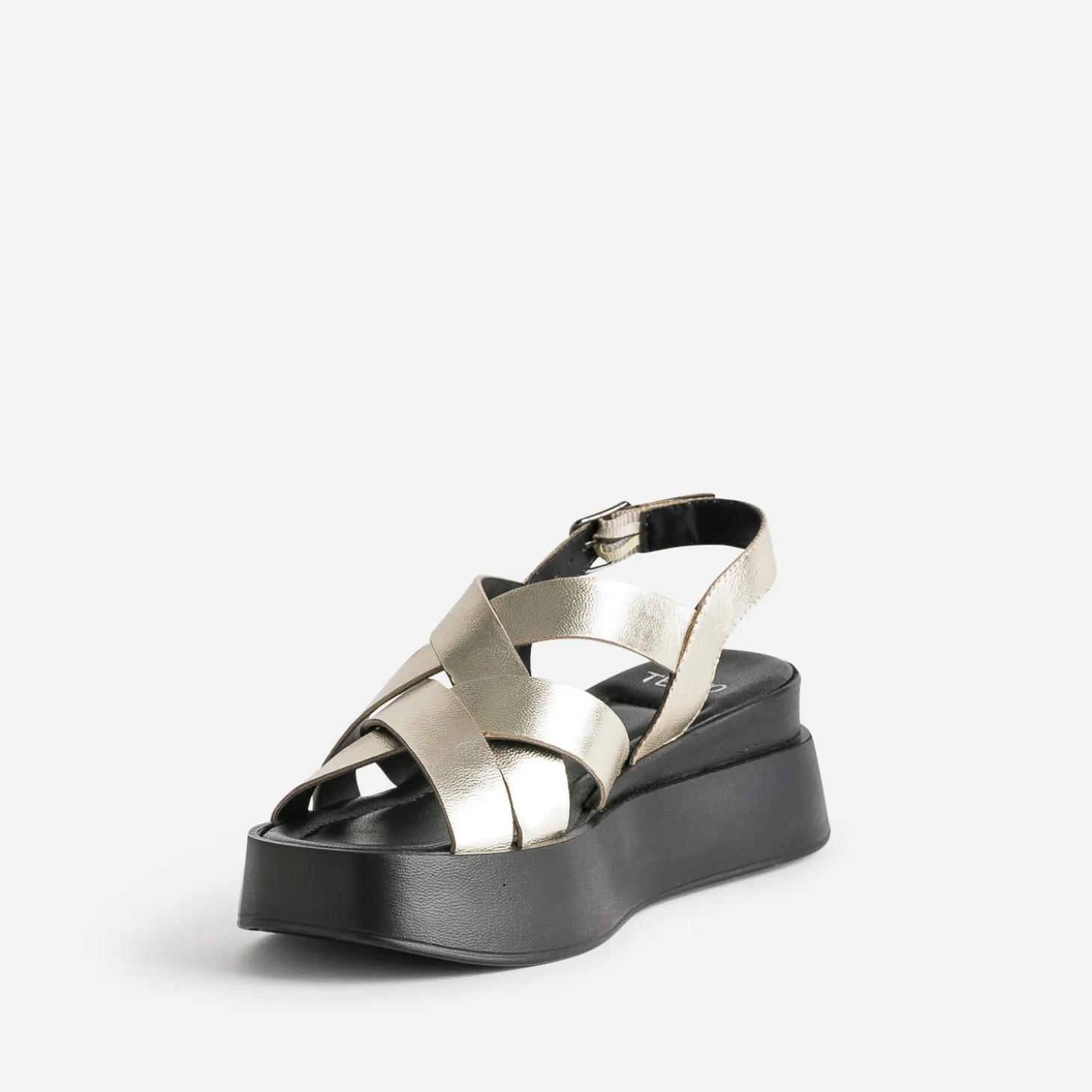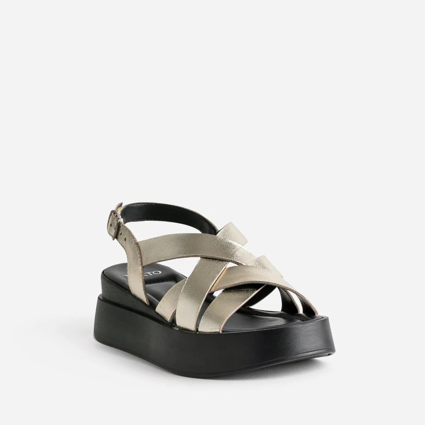 Brides croisées en cuir doré sur maxi semelle noire compensée : cette sandale pour femme s’annonce comme une pépite de la saison. Préférez-la avec un look s’autorisant des pièces à volume : sweat, top loose, pantalon large.