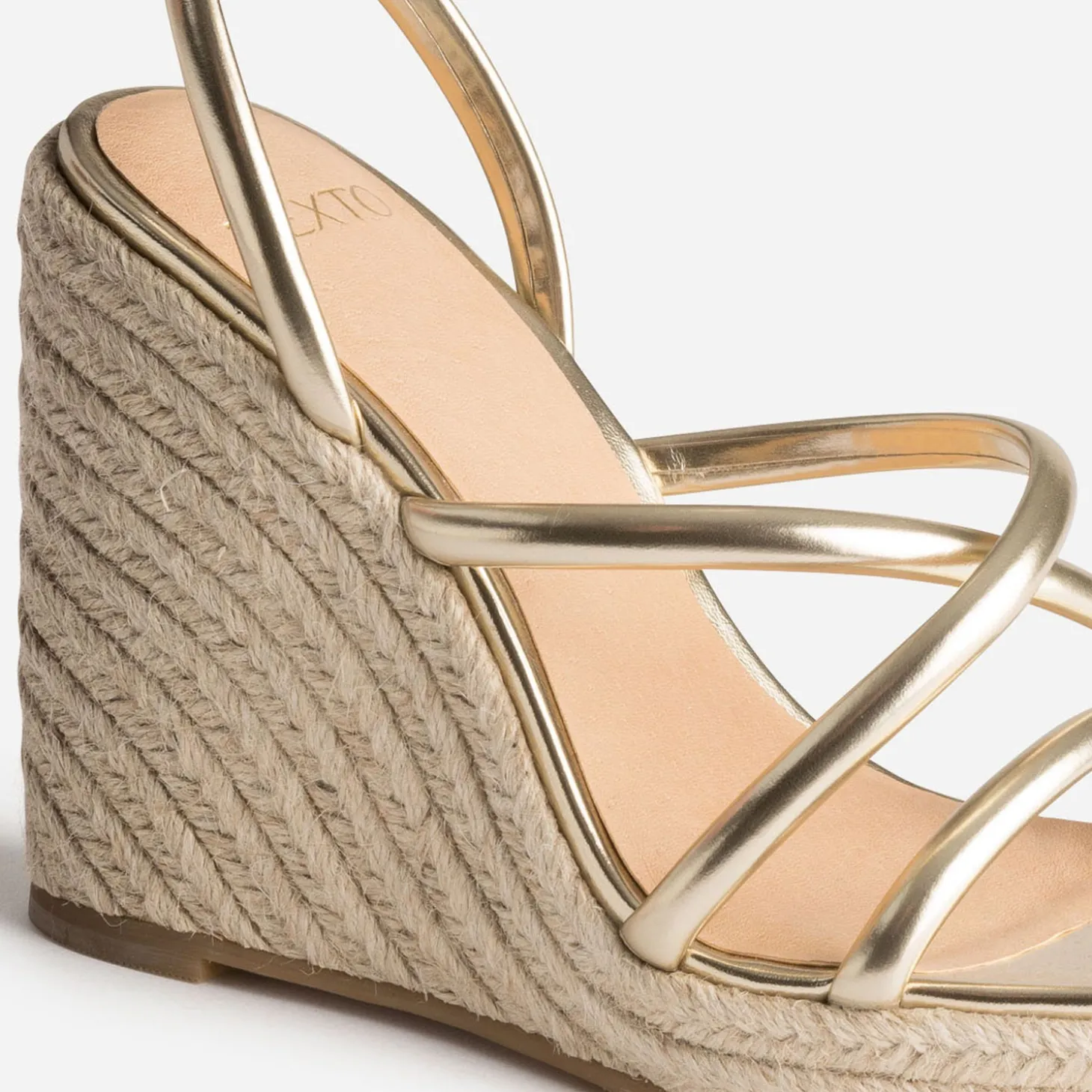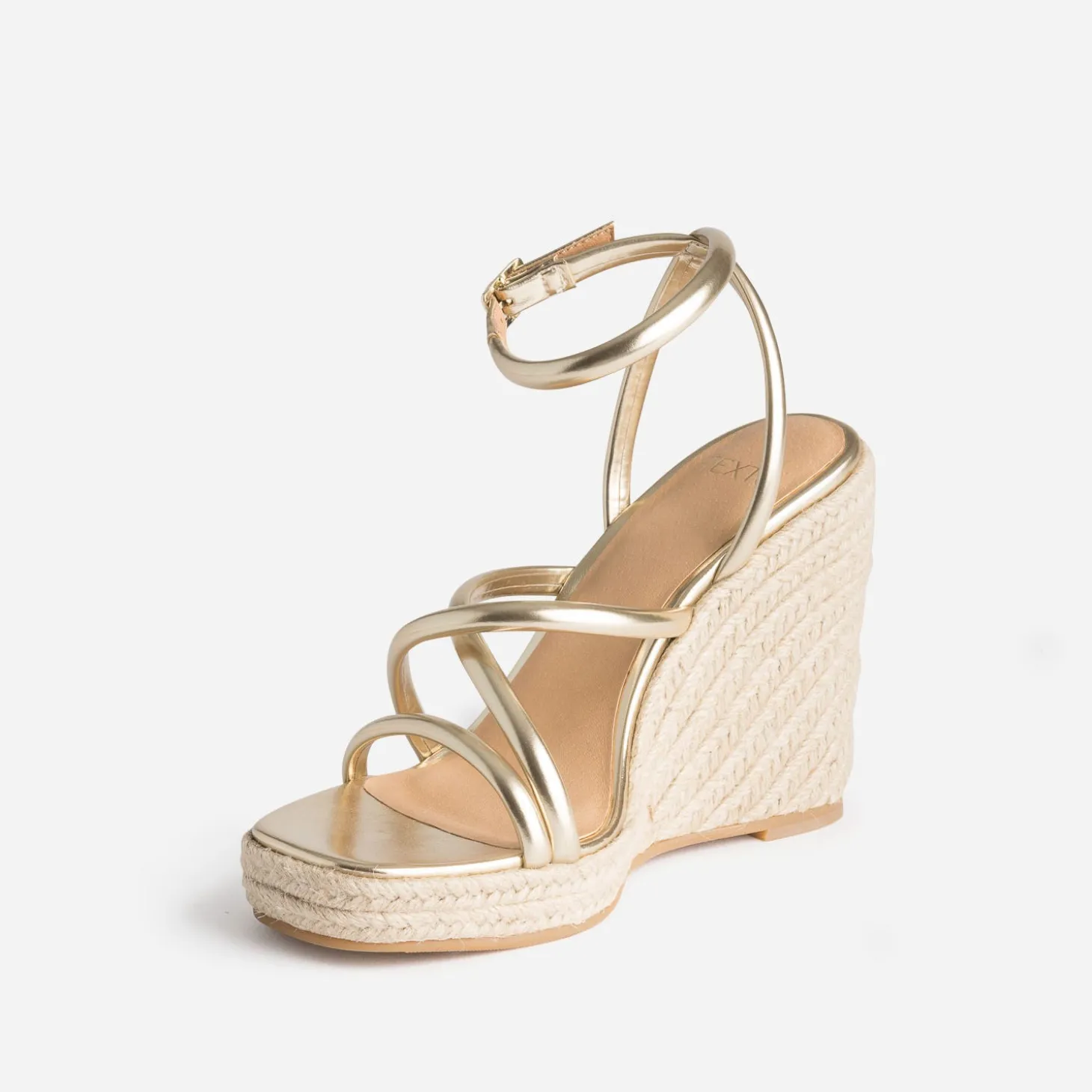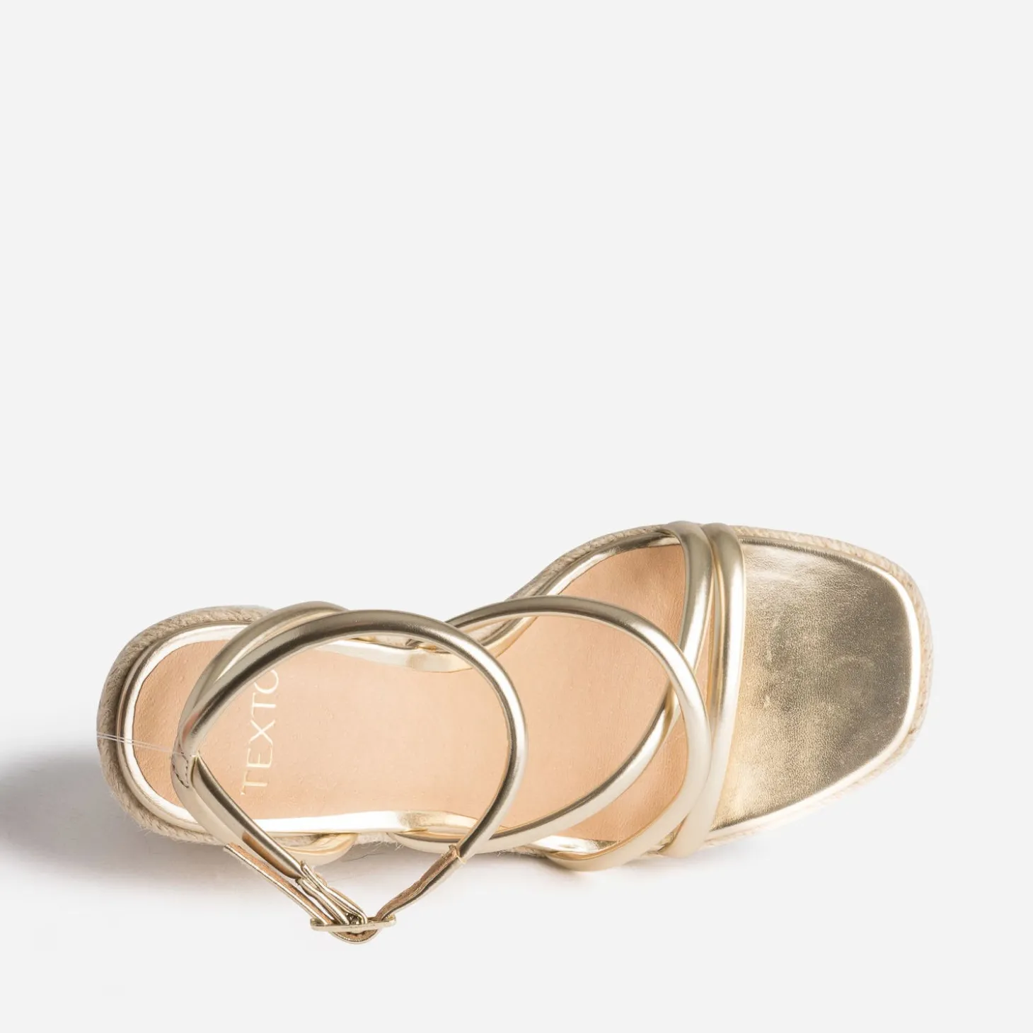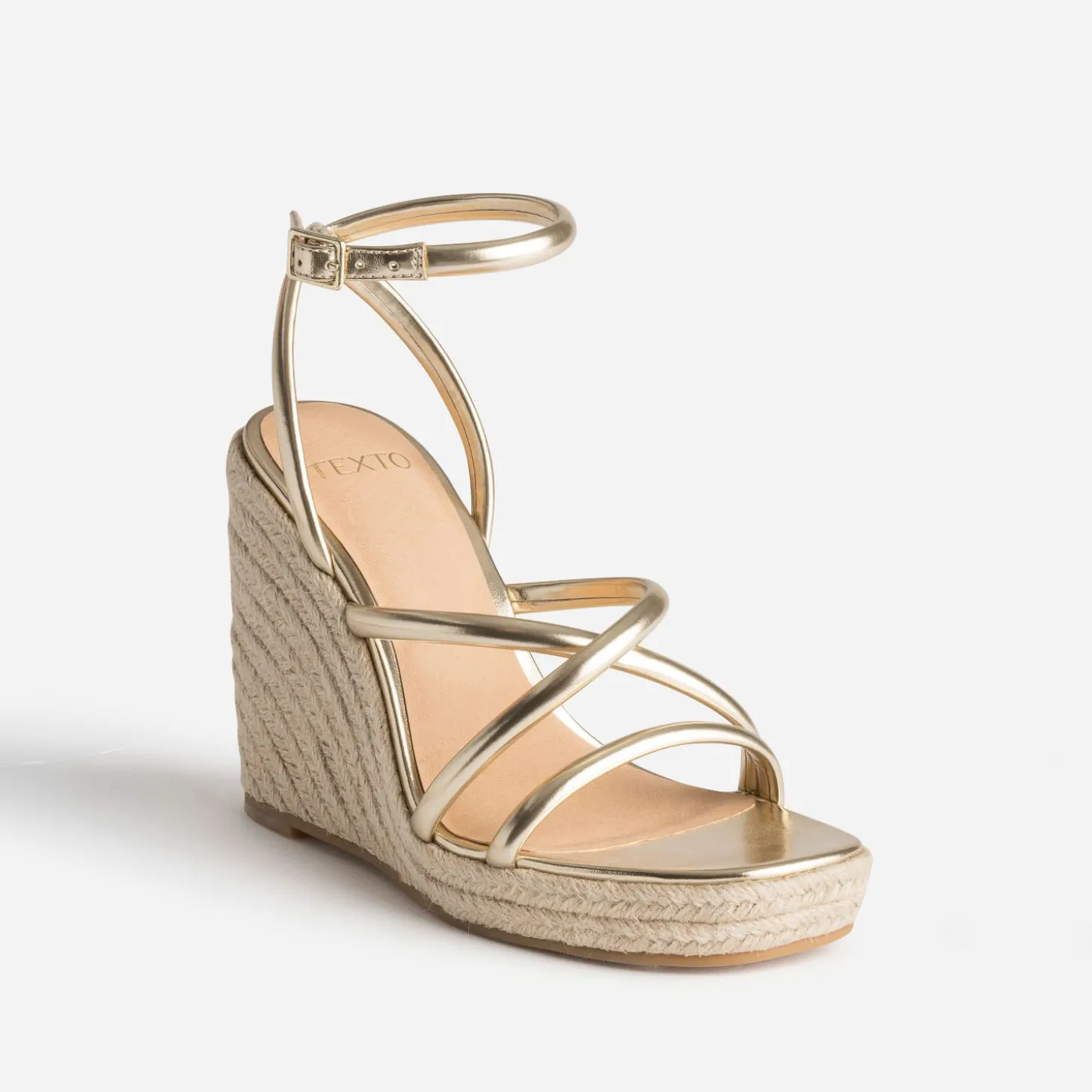 Envie de prendre de la hauteur ? Cette sandale pour femme est une solution. En matière synthétique dorée, elle présente un talon compensé de 11 cm à l’arrière et 2 cm à l’avant. Bout carré et fines brides matelassées lui apportent une belle modernité. Avec ? Combinaison-pantalon, robe ou look denim bleu, tout s’accorde à a perfection.