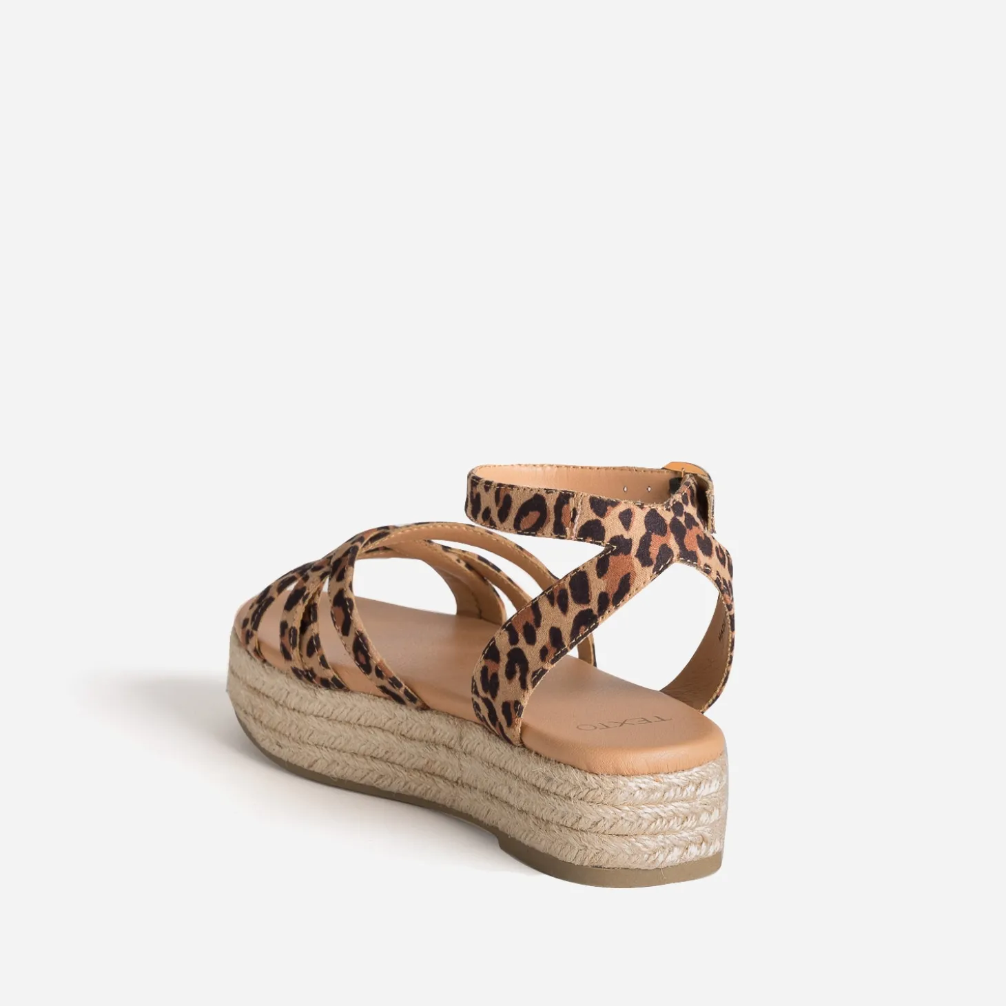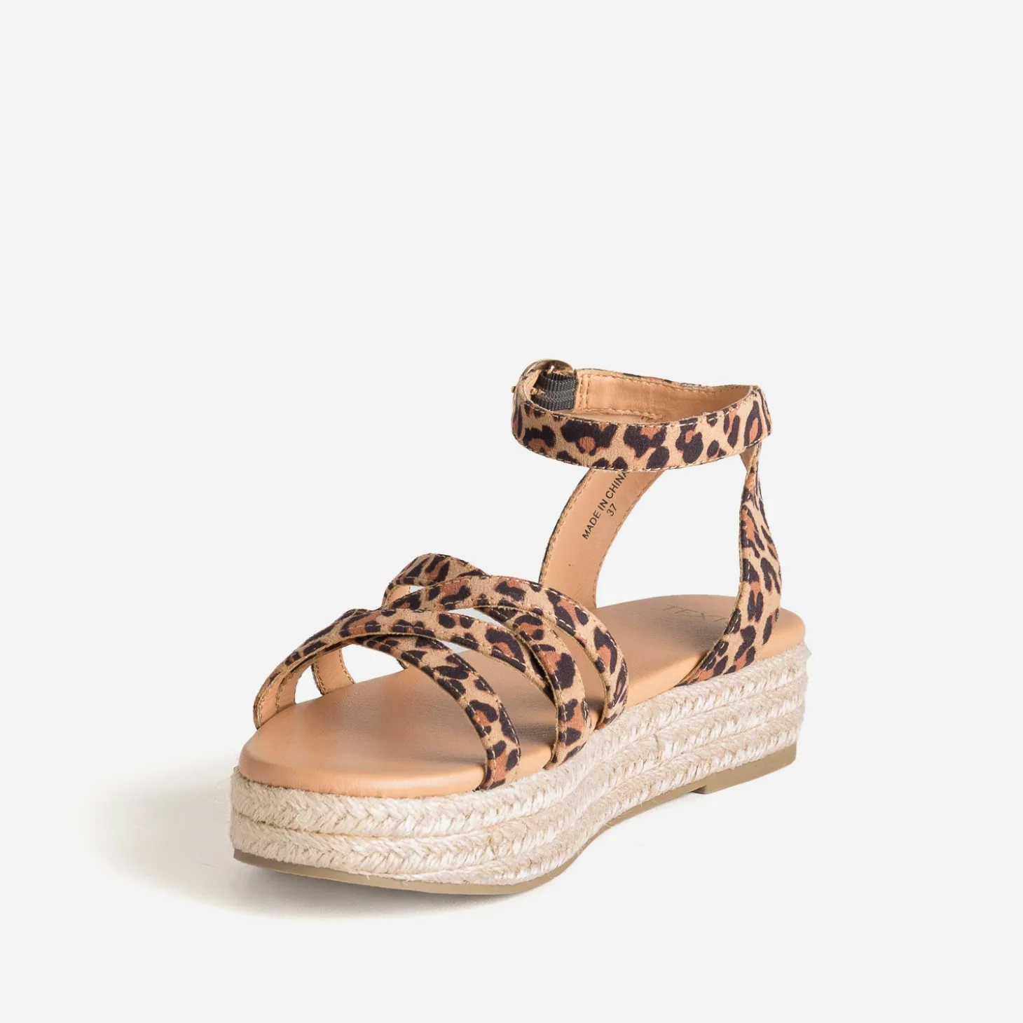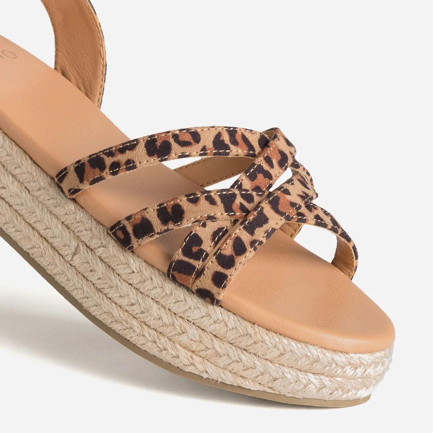 Brides croisées sur le dessus du pied. Bride autour de la cheville. La sandale à plateforme ne manque pas de maintenir le pied. En textile beige, elle ose l’imprimé léopard incontournable de la saison sur une semelle en corde. Un modèle à essayer avec une robe noire, un pantalon large ou un short : elle s’accorde avec tout !