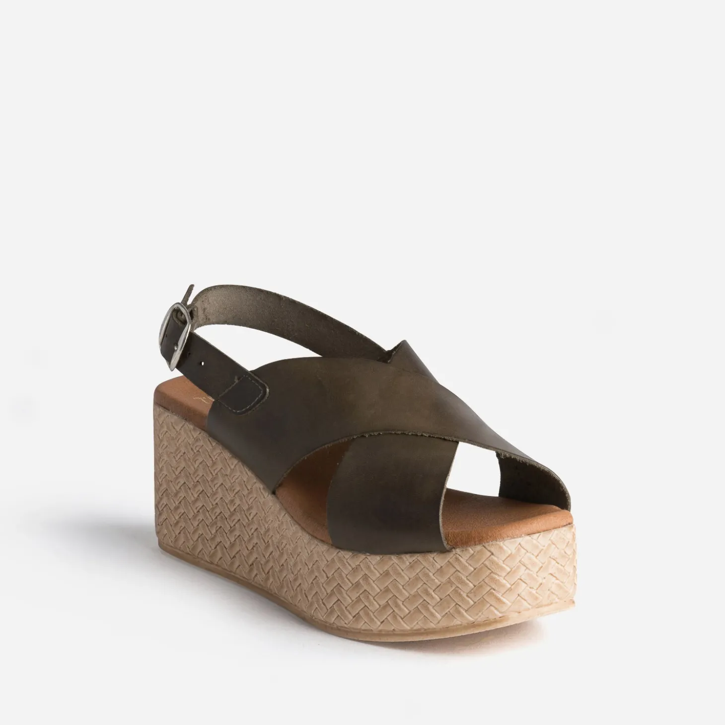 Le kaki est le coloris tendance de la saison. Vous l’aimiez sur le bout de vos ongles ? Vous allez l’adorer jusqu’au bout de vos pieds, grâce à cette sandale pour femme. Montée sur une semelle compensée avec effet tressage, elle maintient le pied par deux larges brides qui se croisent sur le dessus et se ferment par une boucle sur la cheville. Un modèle à porter avec des camaïeux de beige.