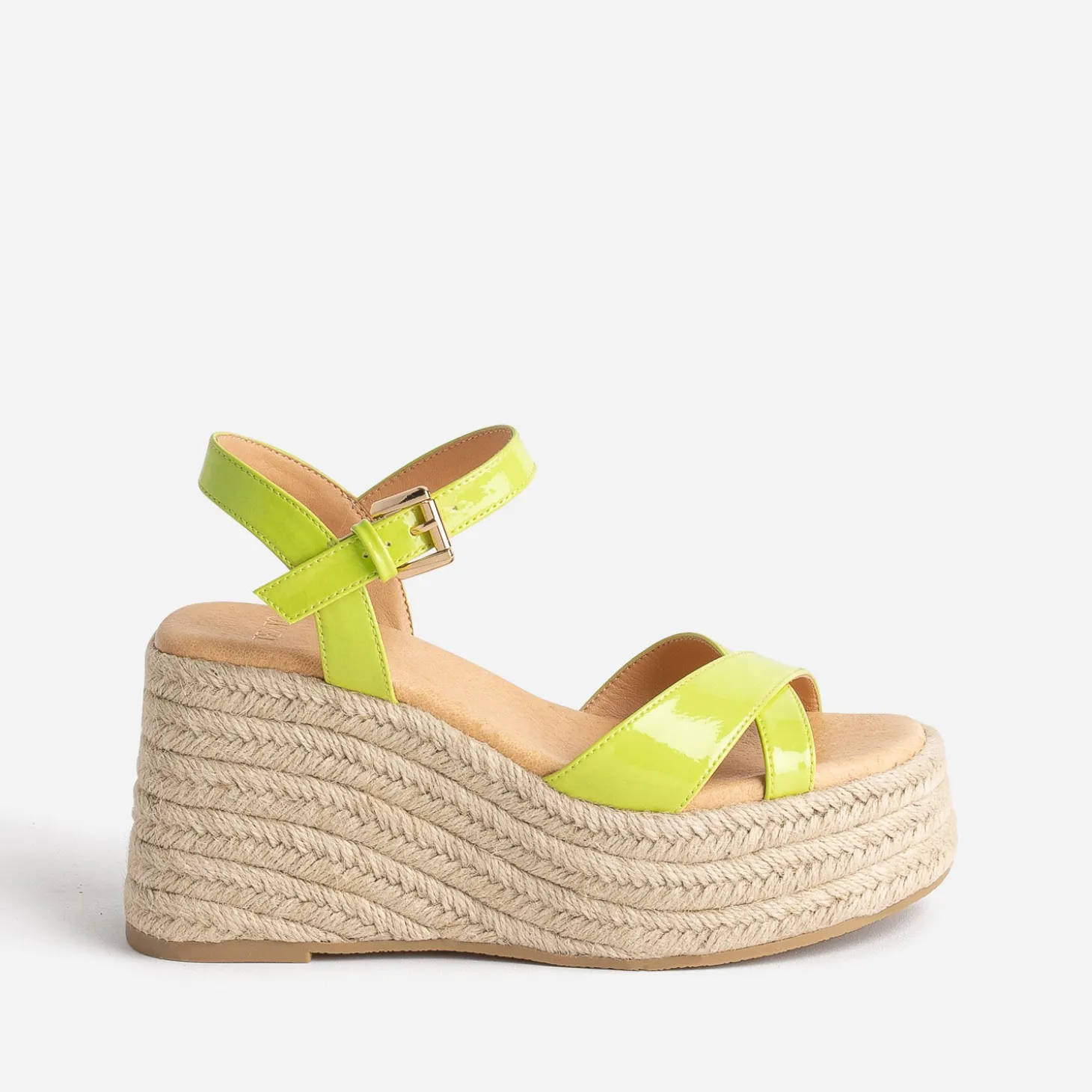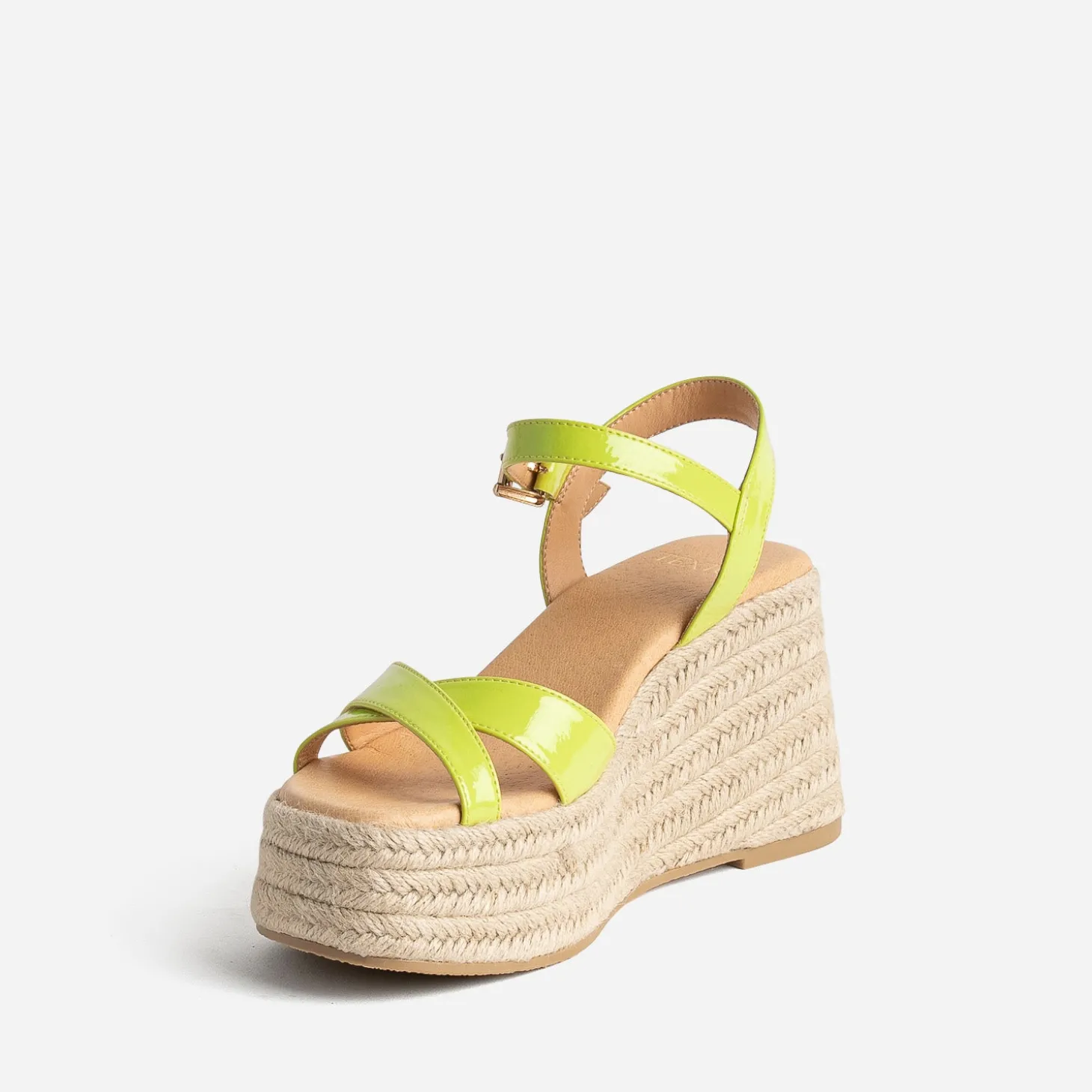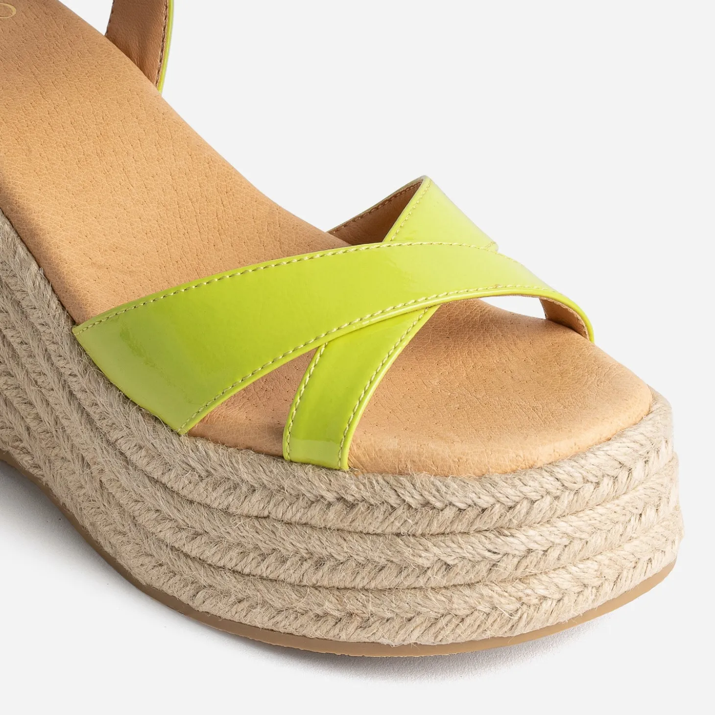 L’invention parfaite pour gagner des centimètres sans risques ? C’est la sandale compensée, avec plateforme. Ici, la semelle de 9 cm à l’arrière et de 4 cm à l’avant est entièrement recouverte de corde naturelle. Dessus, les brides en matière synthétique se déclinent en coloris lime, avec finition vernie. A vous les jolies robes dans les nuances de bleu, de vert ou de rose.