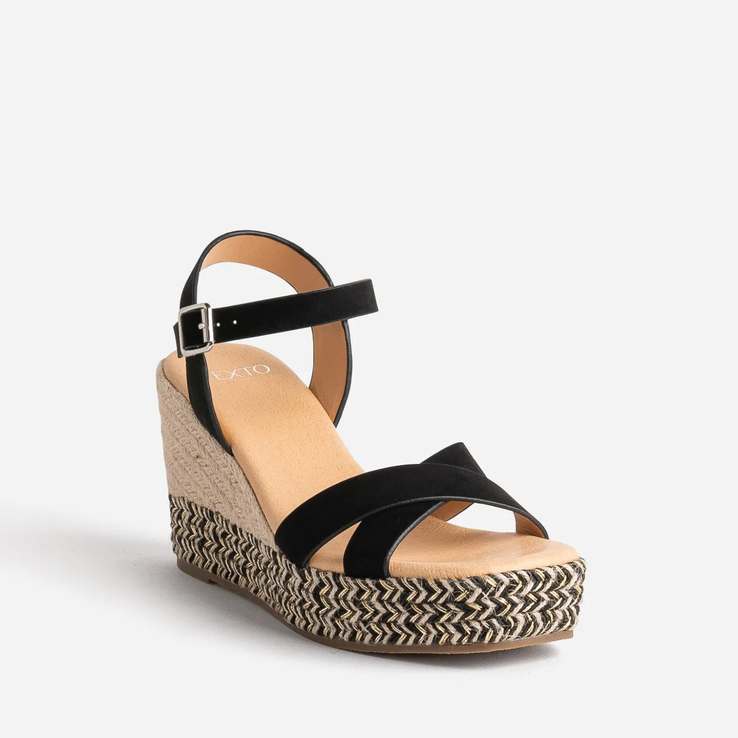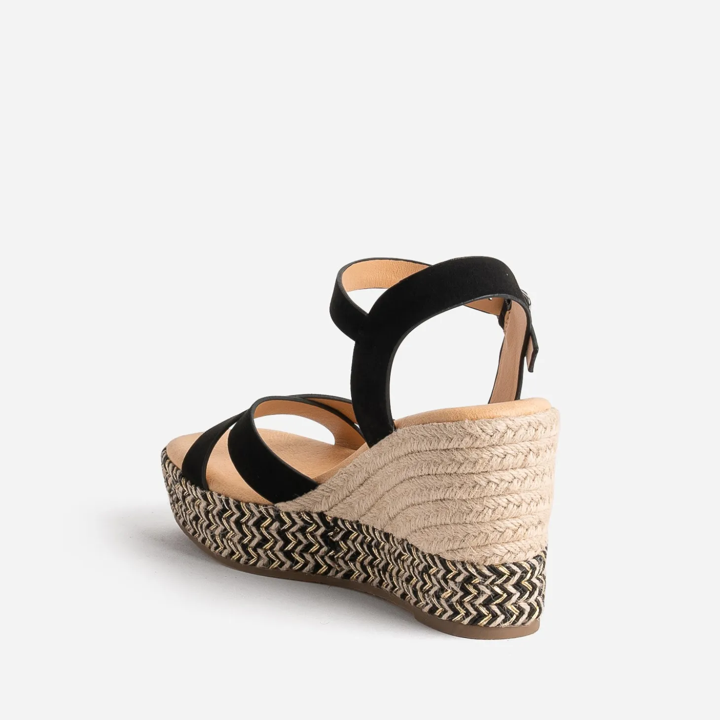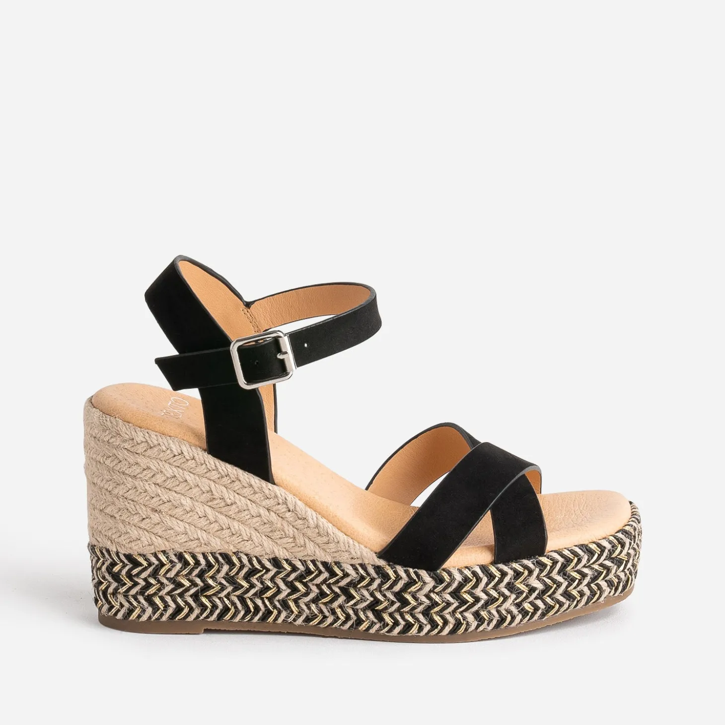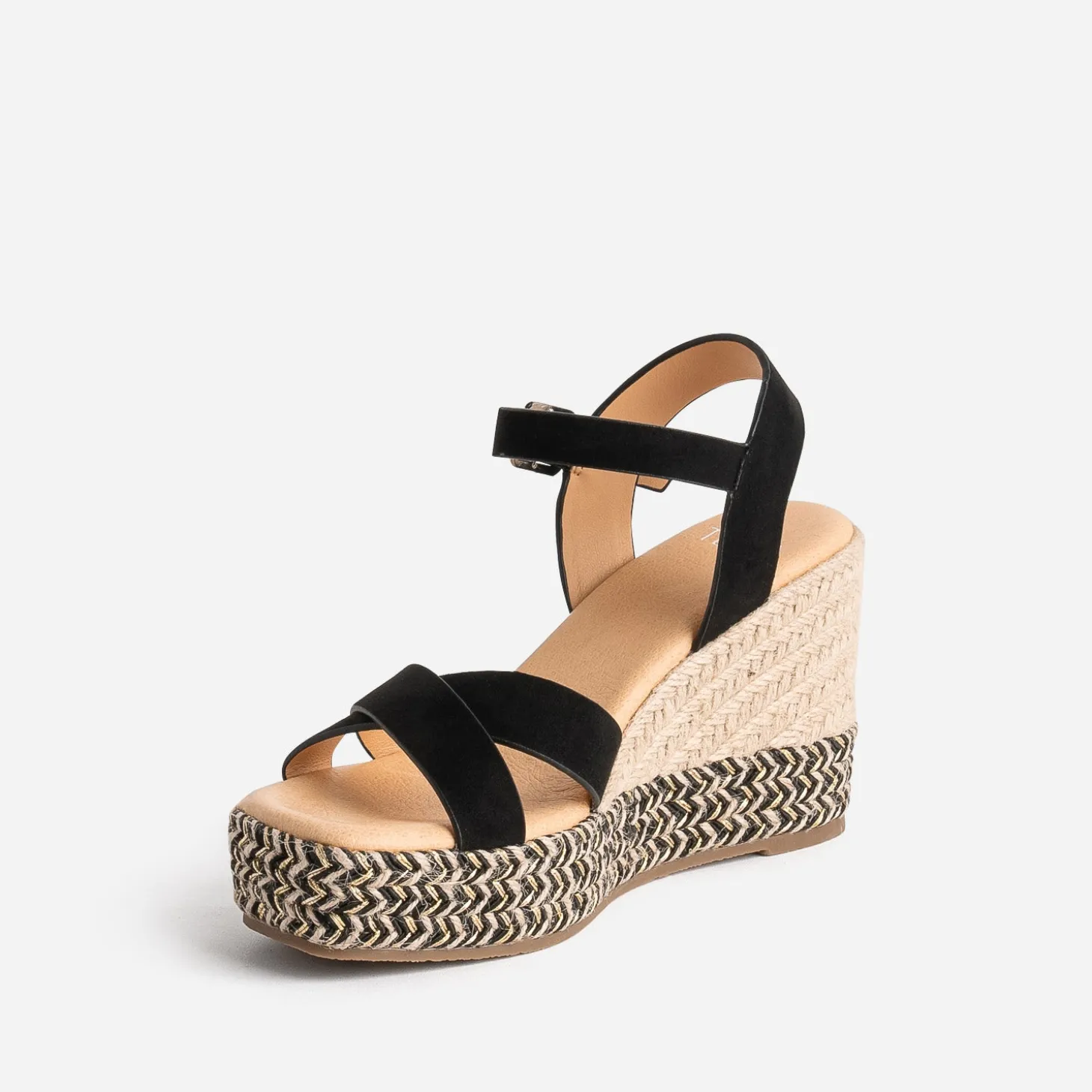 Faites confiance à la sandale compensée, pour vous accompagner tout au long de l’été. Les brides, en matière synthétique suédée, osent un coloris noir, qui fait écho à la semelle en corde. 9 cm à l’arrière, 3 cm à l’avant, et une semelle première moussée, pour un confort inégalé. Adoptez tout de suite un esprit aventurier, en l’associant avec une veste saharienne, un jean blanc carré et de gros bracelets en bois.